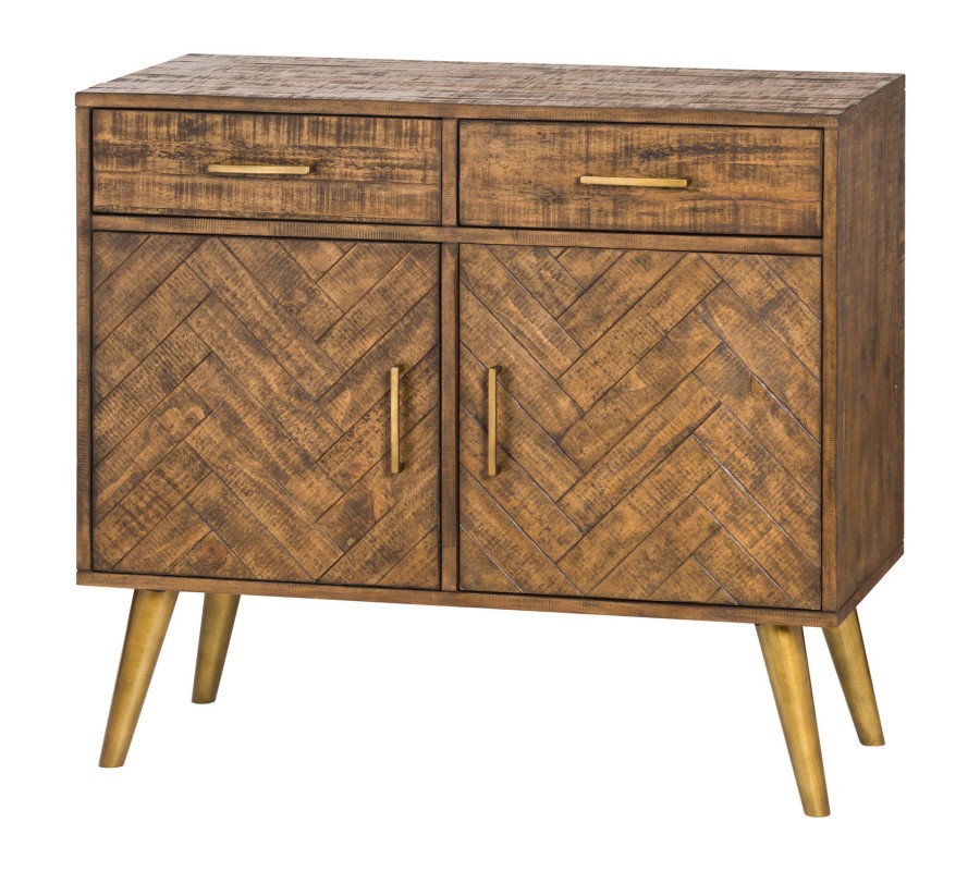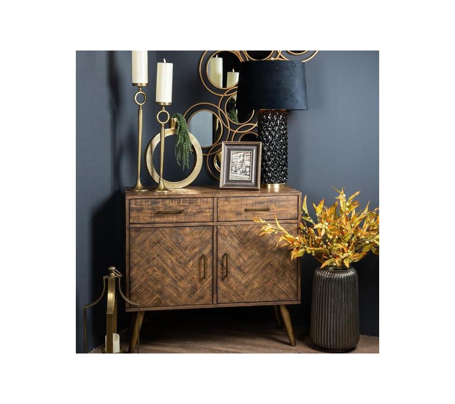 Jedinečný príborník z masívneho dreva z kolekcie Havana Oro, kontemporárnej kolekcie ručne vyrábaného nábytku, pre ktorú je typický parketový vzor v kombinácii s antickou zlatou farbou, je vynikajúcou voľbou ak túžite do Vašej jedálne vniesť nádych populárneho retra. Príborník disponuje dostatkom úložného priestoru ukrývajúceho sa za párom dvierok a taktiež v podobe dvoch praktických zásuviek, vhodných na uchovávanie príboru alebo iných stolovacích potrieb. Masívne telo príborníka je postavené na štyroch drevených nožičkách vo farbe antickej zlatej, ladiac tak s úchytkami nachádzajúcimi sa na dvierkach a zásuvkách, dodávajúc tomuto kúsku už spomínaný retro nádych.