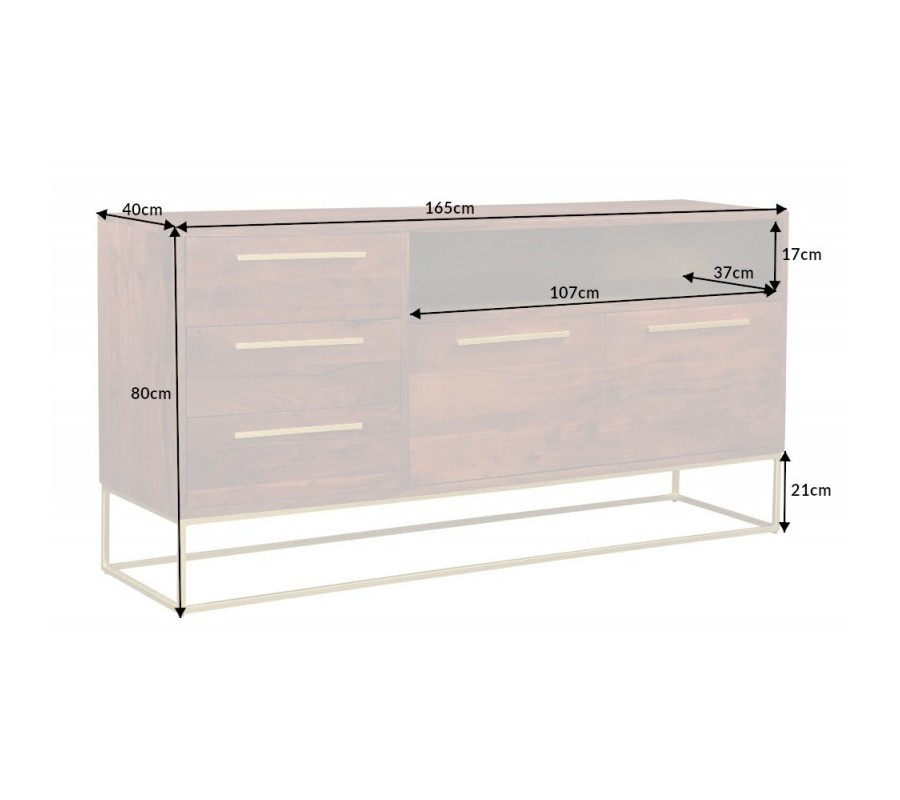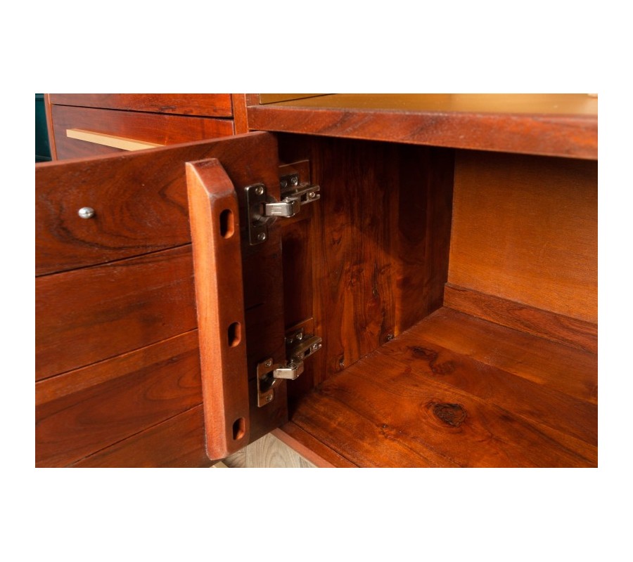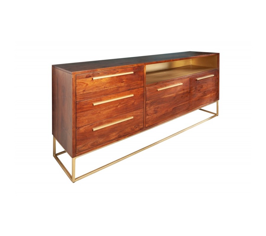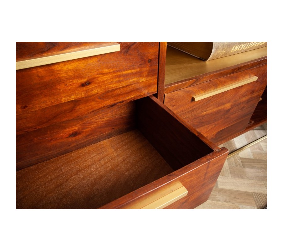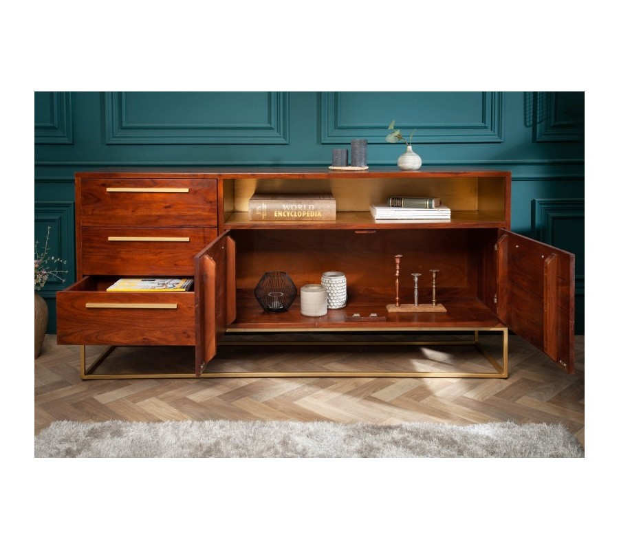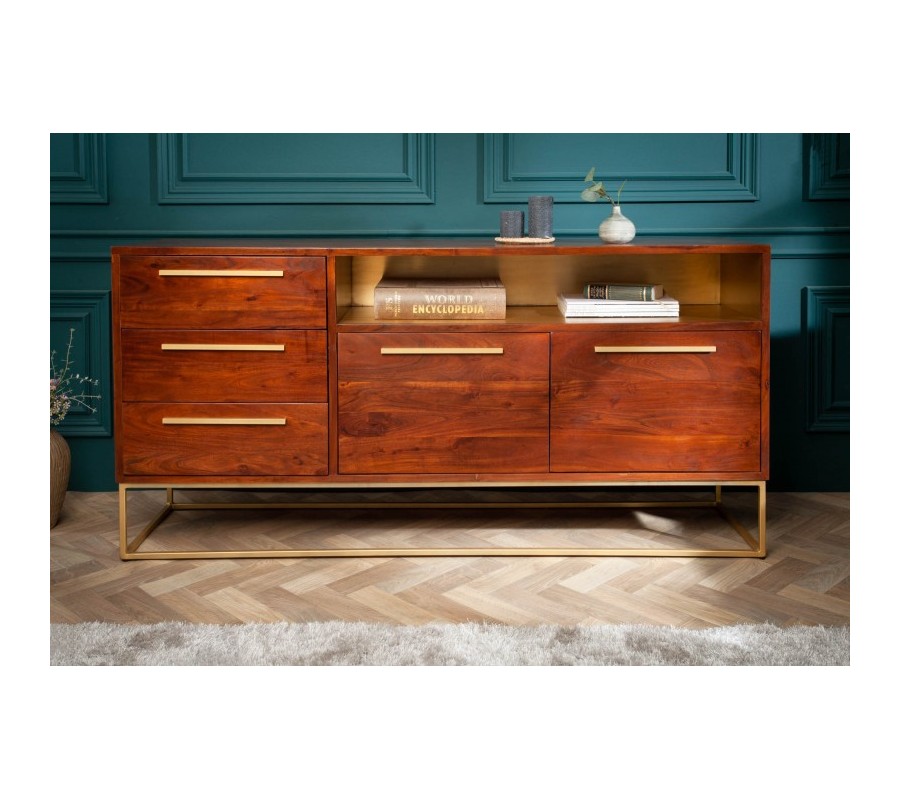 Dizajnový príborník Alyr je skvelým kúskom pre všetkých milovníkov retro či art-deco štýlu. Je vyrobený z kvalitného masívneho akáciového dreva, na ktorého povrchu je krásne vidieť jeho prirodzenú kresbu. Prírodný materiál je doplnený o kovovú konštrukciu a úchytky zlatej farby, ktoré príborníku dodávajú art-deco nádych. Disponuje tromi praktickými zásuvkami, poličkami s dvierkami a dvomi otvorenými poličkami vhodnými na uloženie kníh, dokumentov či dekorácií. Štýlový príborník Alyr k vám domov zaručene vnesie príjemný retro nádych a vďaka naturálnej hnedej farebnosti sa dá ľahko doladiť do tmavých i svetlejších priestorov.