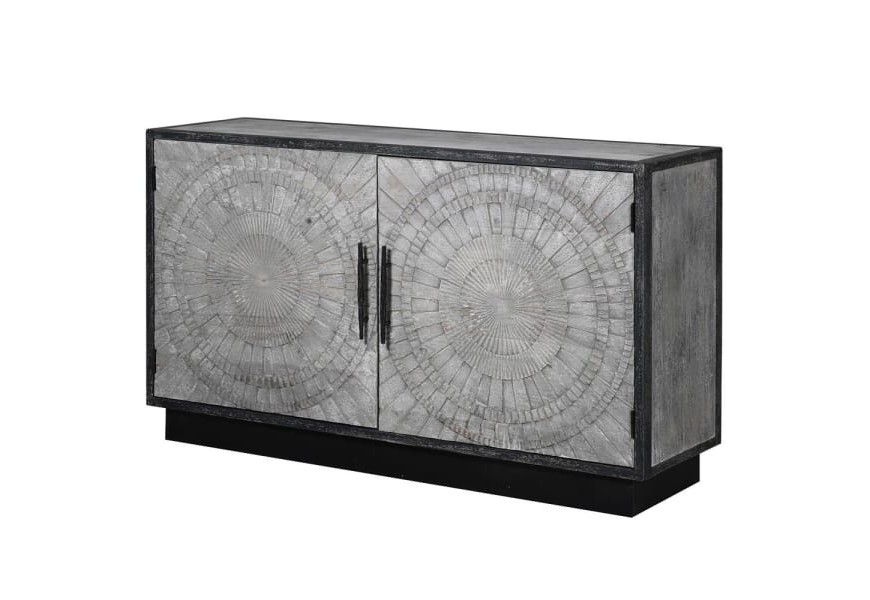 Dizajnový príborník z masívneho dreva v sivej farbe Vás už na prvý pohľad upúta svojím jedinečným mozaikovým zdobením predných dvierok smerujúce zo stredu dvierok k ich okrajom. Svetlosivá povrchová úprava necháva vyniknúť prírodnú štruktúru dreva, čím vo Vašej domácnosti navodí pokojnú prírodnú atmosféru. Jemná sivá farba je doplnená kontrastným tmavošedým zafarbením hrán a drevenej podstavy, ktorá dodáva dvojdverovému príborníku stabilitu. Vnútorná časť príborníku, ukrývajúca sa za párom mozaikových dvierok, je rozdelená vertikálnou priečkou na dve časti, pričom obe časti disponujú odnímateľnou poličkou, zabezpečujúc tak dostatok úložného priestoru.