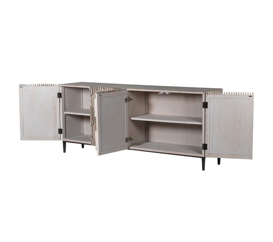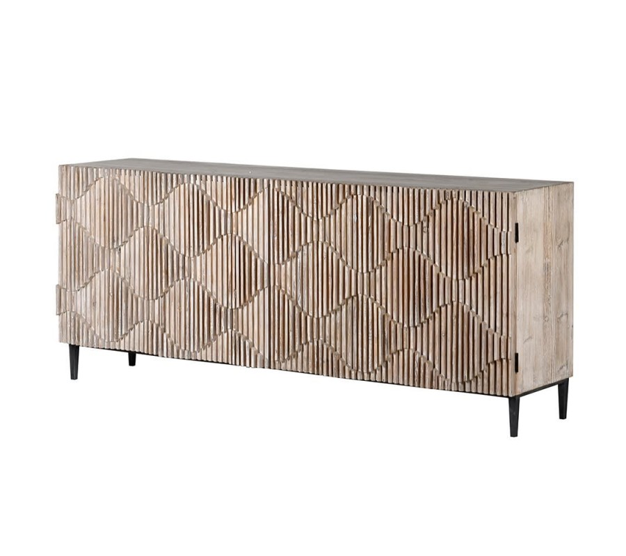Jedinečný dizajn luxusného príborníka Millenium z masívneho dreva vyniká ručne vyrezávanou drevenou plochou na dvierkach. Výzdoba dvierok je tvorená z drevených rebier rôznej hrúbky, čím sa dosahuje dizajnový vzhľad pripomínajúci vlny. Príborník poskytuje dostatočné množstvo úložného priestoru v podobe dvoch väčších a dvoch menších poličiek. Jerozdelený na dve časti so štyrmi dvierkami chrániacimi úložný priestor. Povrchová úprava v prírodnej svetlohnedej farbe nechá vyniknúť prirodzenú kresbu a štruktúru dreva. Stabilitu masívneho príborníka zaručujú čierne nožičky z kovu vytvárajúce dizajnový kontrast k masívnemu telu. Príborník Millenium odporúčame kombinovať s jedálenským stolom a stoličkami z masívneho dreva vo svetlejšej prírodnej farbe, rovnako ako aj kontrastnými kovovými kúskami v čiernej alebo zlatej farbe.