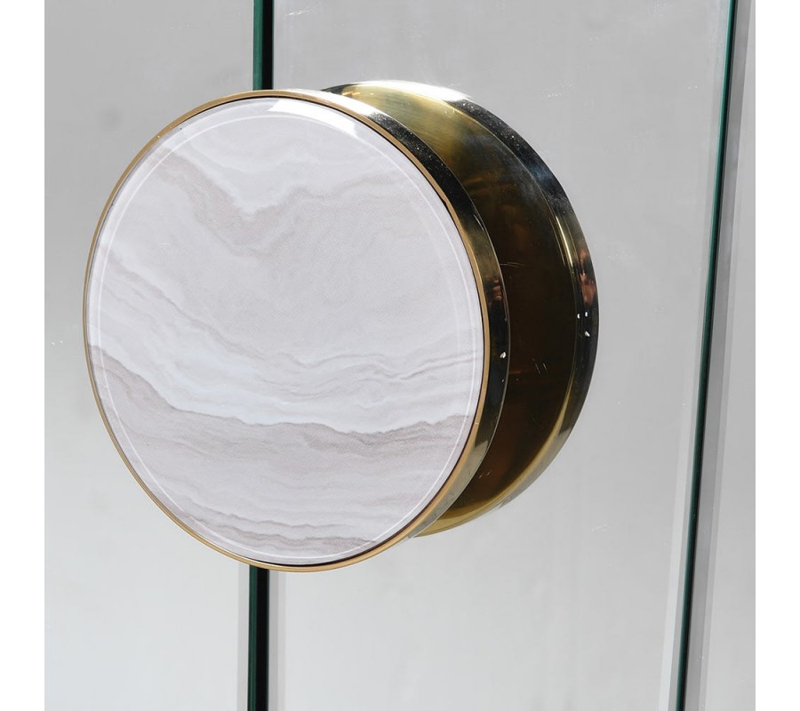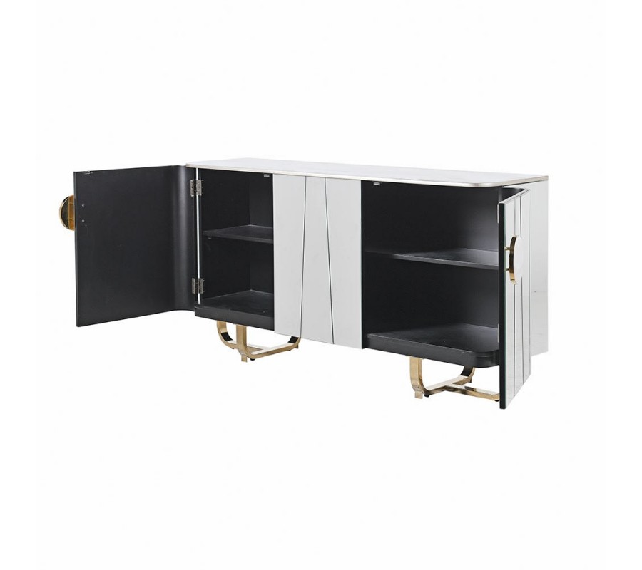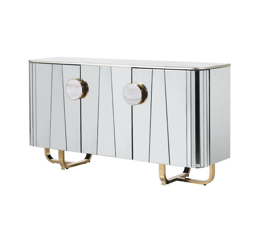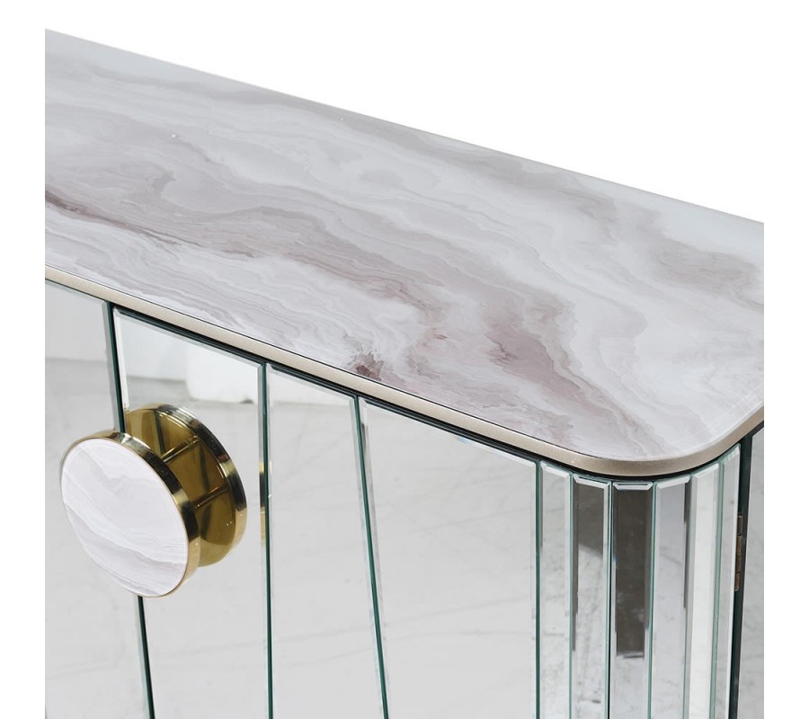Zrkadlový príborník s luxusným dizajnom je jedinečným kúskom, ktorý nemôže chýbať z interiéru žiadnemu milovníkovi moderných zrkadlových nábytkov. Príborník sa skladá z viacerých zrkadlových častí, má obdĺžnikový tvar so zaoblenými hranami, taktiež je obohatený štýlovými kruhovými úchytkami. Príborník stabilne stojí na dvoch oblúkových kovových nohách v lesklej zlatej farbe. Povrch okrúhlych úchytiek a povrch vrchnej časti príborového stolíka pokrýva materiál s imitáciou bieleho mramoru, čo mu dodáva moderný a nadčasový vzhľad. Pozlátené kovové nohy príborníka v art-deco štýle majú nekaždodenný tvar a to dodáva nábytku čaro. Príborník nie je len krásnym kúskom, ale aj praktickým, keďže disponuje úložnými priestormi v podobe štyroch poličiek s dvomi dvierkami. Miestnosť v ktorom je umiestnený luxusný príborník môžete doplniť o ďalšie zrkadlové nábytky s minimalistickým dizajnom.