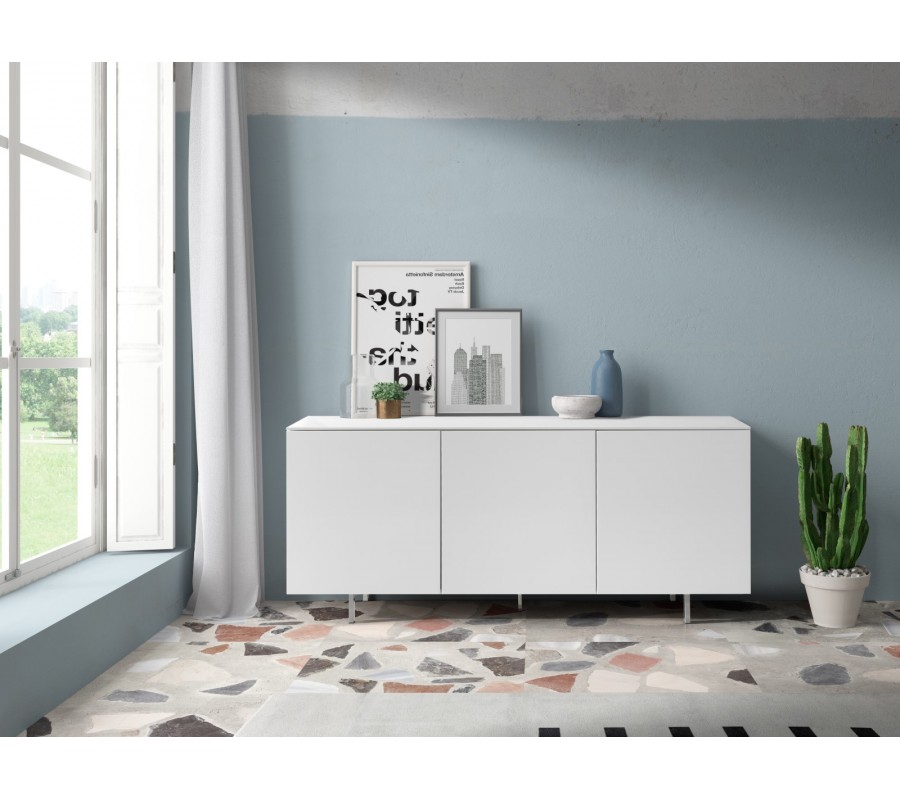 Moderný trojdverový príborník Henning v lesklom bielom prevedení s chromovými nožičkami 180cm