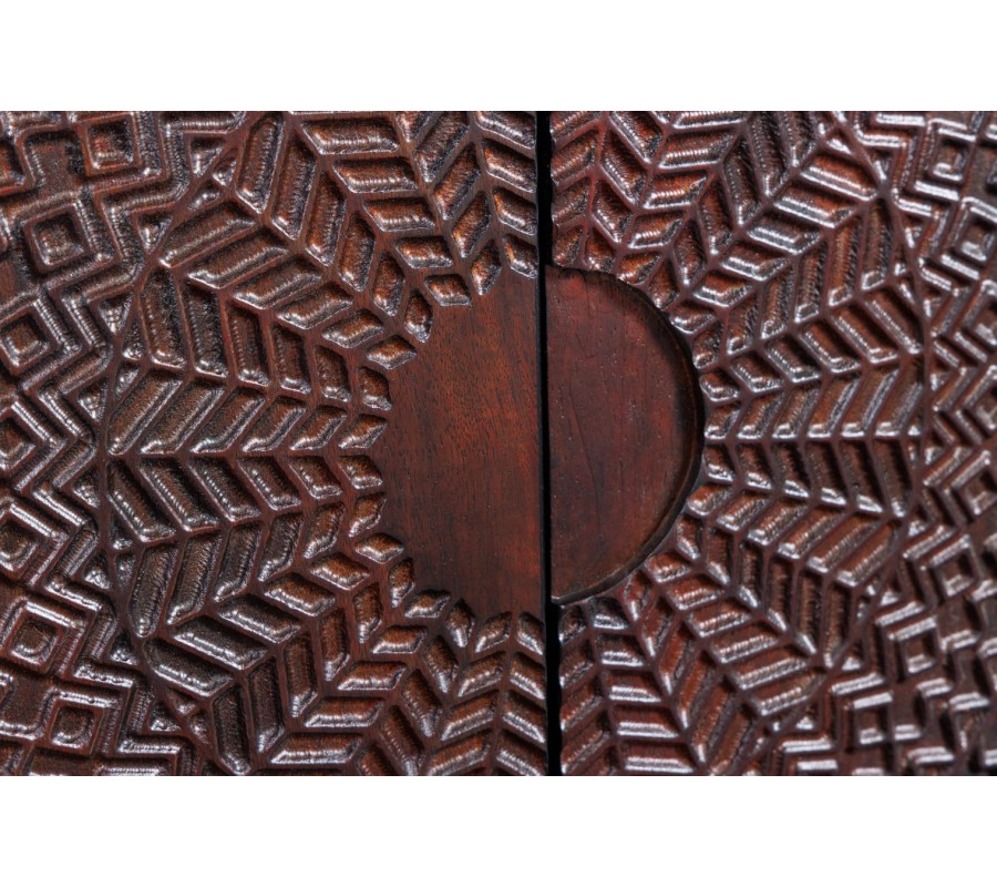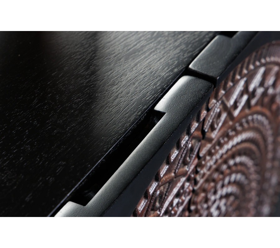 Exkluzívny príborník Mandala vás prenesie do čarovného orientu. Je vyrobený z kvalitného mangového masívneho dreva s tmavou povrchovou úpravou. Mohutné masívne telo z prírodného materiálu dopĺňajú elegantné kovové nožičky zlatej farby. Dominantným prvkom príborníka je detailné ornamentálne vyrezávanie na dvierkach tvoriace kruhový tvar mandaly. Dvierka disponujú magnetmi a tak dizajn nie je vizuálne rušený úchytmi. Úložný priestor v podobe štyroch priestranných poličiek sa dá skvelo využiť pri umeistnení v jedální aj obývačke. Luxusný príborník Mandala odporúčame umiestniť do interiérov ladených v orientálnom alebo etno štýle v kombinácii s bohatými ornamentálnymi doplnkami a nábytkom z prírodných materiálov.