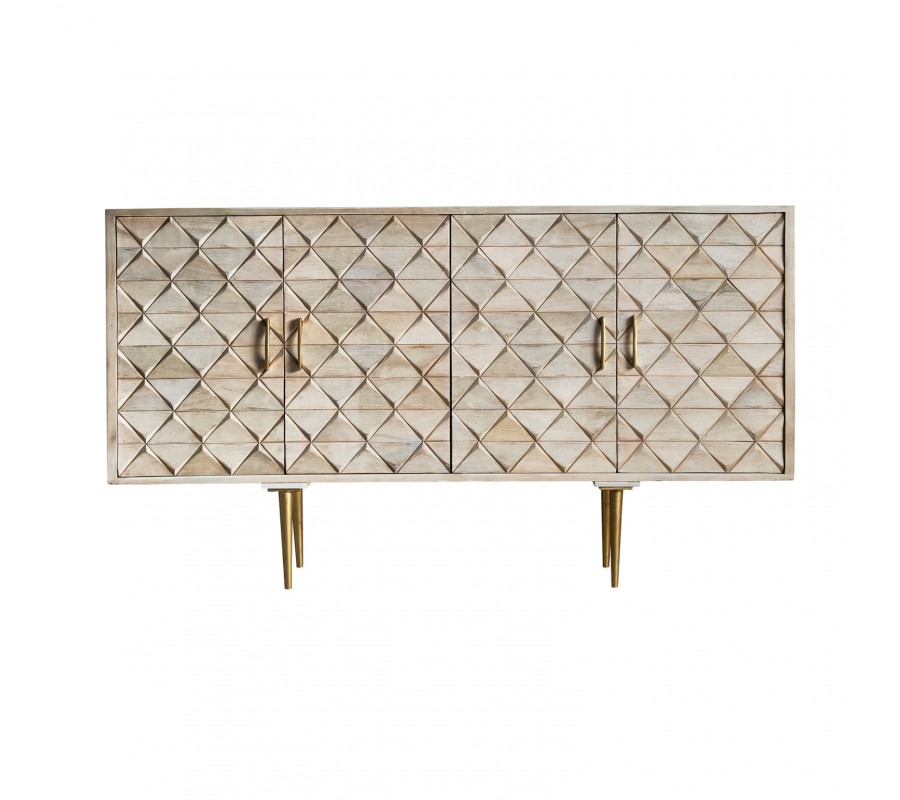 Art-deco príborník Marilla do jedálne z mangového masívneho dreva so štyrmi dvierkami a zlatými nožičkami z kovu 153cm