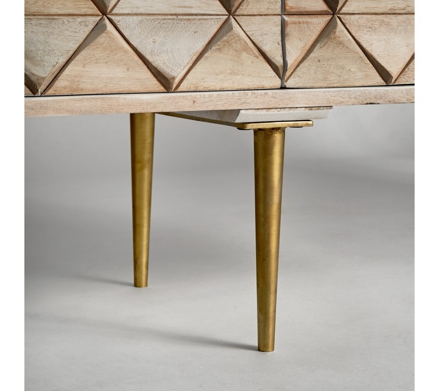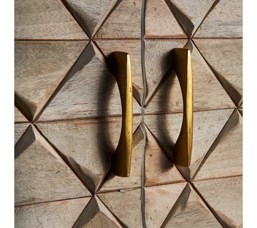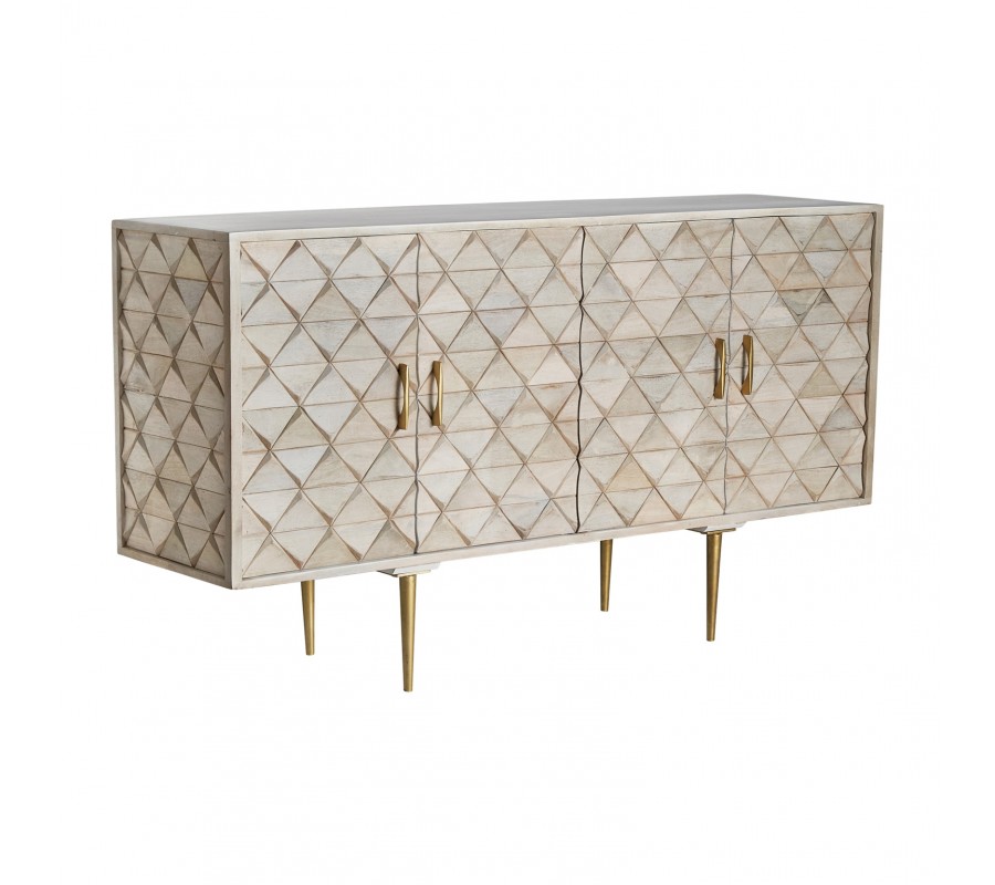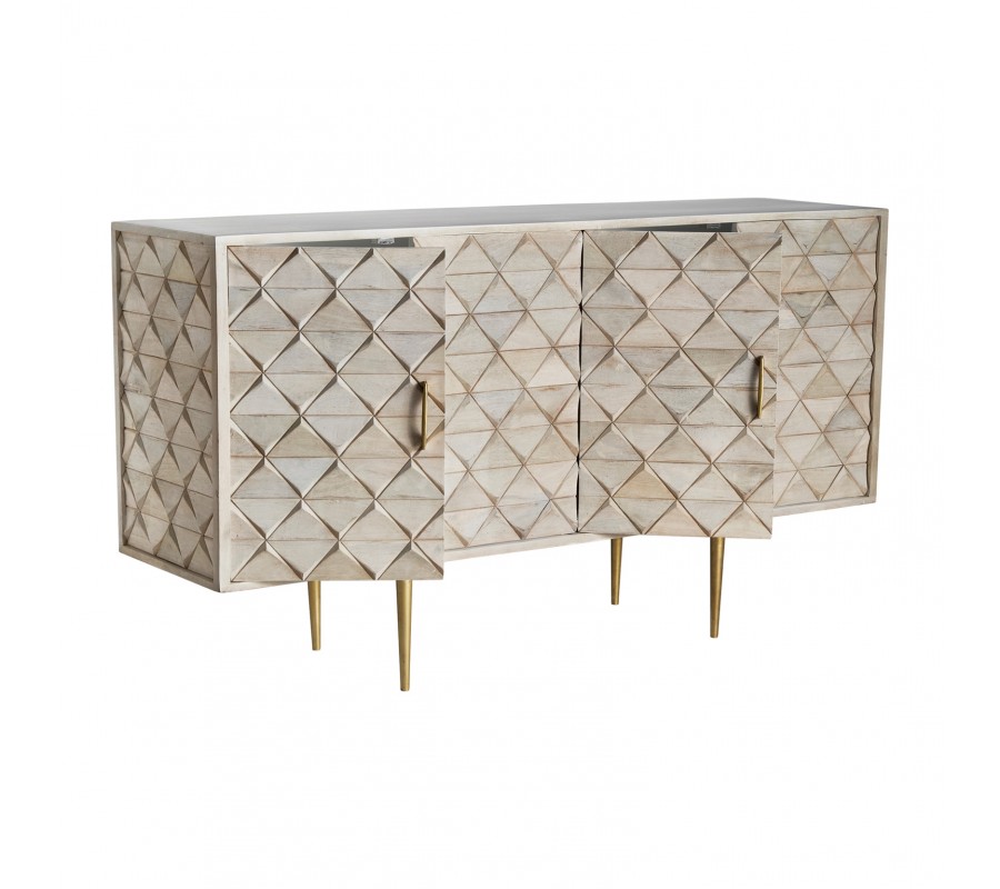 Luxusný príborník Marilla zaujme svojím elegantným vzhľadom v art-deco štýle. Telo príborníka je vyrobené z kvalitného masívneho mangového dreva a nesie sa v svetlohnedom prírodnom odtieni. Povrchová úprava je doplnená o off-white náter, ktorý umocňuje naturálny vzhľad, a taktiež o štýlové geometrické vyrezávané vzory. Celkový dizajn je doplnený zlatými kovovými nožičkami, ktoré v kombinácii s ornamentálnym vyrezávaním vytvárajú jemný nádych art-deco štýlu. Príborník Marilla vás poteší aj svojím bohatým úložným priestorom v podobe poličiek so štyrmi dvierkami, ktoré zdoboia zlaté kovové úchyty. Tento elegantný kúsok možno umiestniť do moderných alebo prírodne ladených interiérov, ktorým chýba dominantný kúsok. Vďaka svojím zlatým prvkom pomôže spestriť priestory vašej obývačky či jedálne. Efekt art-deco štýlu umocníte kombináciou s čalúnenou zamatovou sedačkou, kobercom s vysokým vlasom či zrkadlovými alebo kovovými doplnkami.