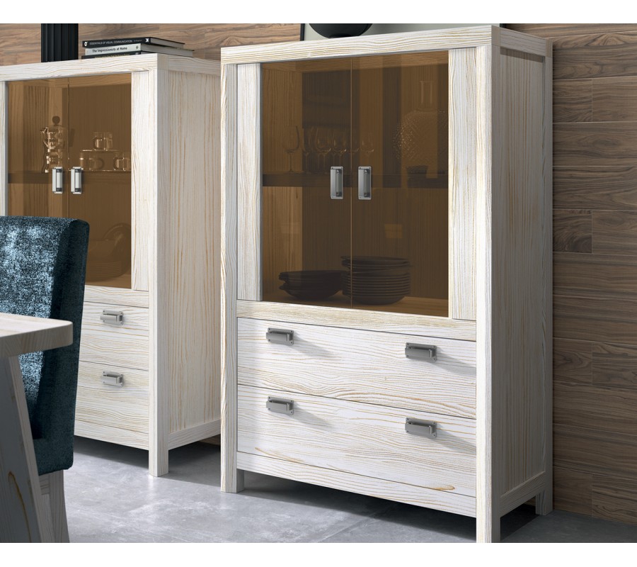 Štýlová vitrína z kolekcie nábytku Lyon vás môže zaujať svojím dizajnom, ktorému dominuje jeho mohutný masívny rám v kombinácií s jeho prírodným masívnym vyhotovením. Priame tvare vitríny Lyon sú doplnené o nízke nožičky vďaka čomu tento kúsok naberá veľmi jemný koloniálny nádych. Sklenené dvierka vitríny vytvárajú určitú jemnosť, ktorá vytvára krásny kontrast so spomenutým mohutným rámom. Tento kúsok inšpirovaný modernými trendami ponúka okrem sklenených dvierok s vnútornou poličkou aj dve rozmerné a praktické zásuvky s kovovými rukoväťami. Nízka vitrína Lyon môže byť využitá taktiež aj ako príborník a vďaka možnosti voľby farebného prevedenia dreva aj moderných rukovätí si môžete upraviť tento produkt tak, aby vynikol vo vašom interiéri a vyhovel každej vašej požiadavke.