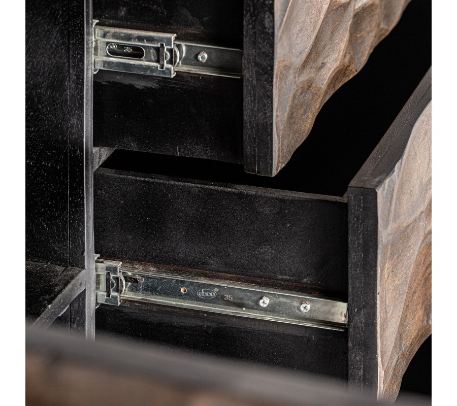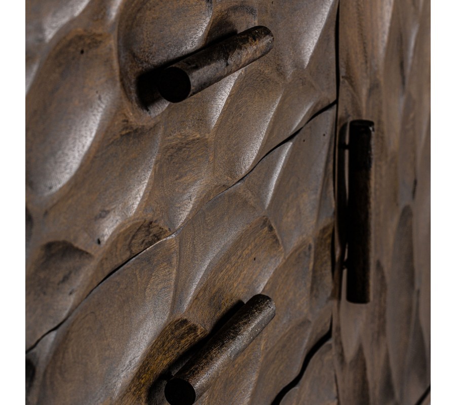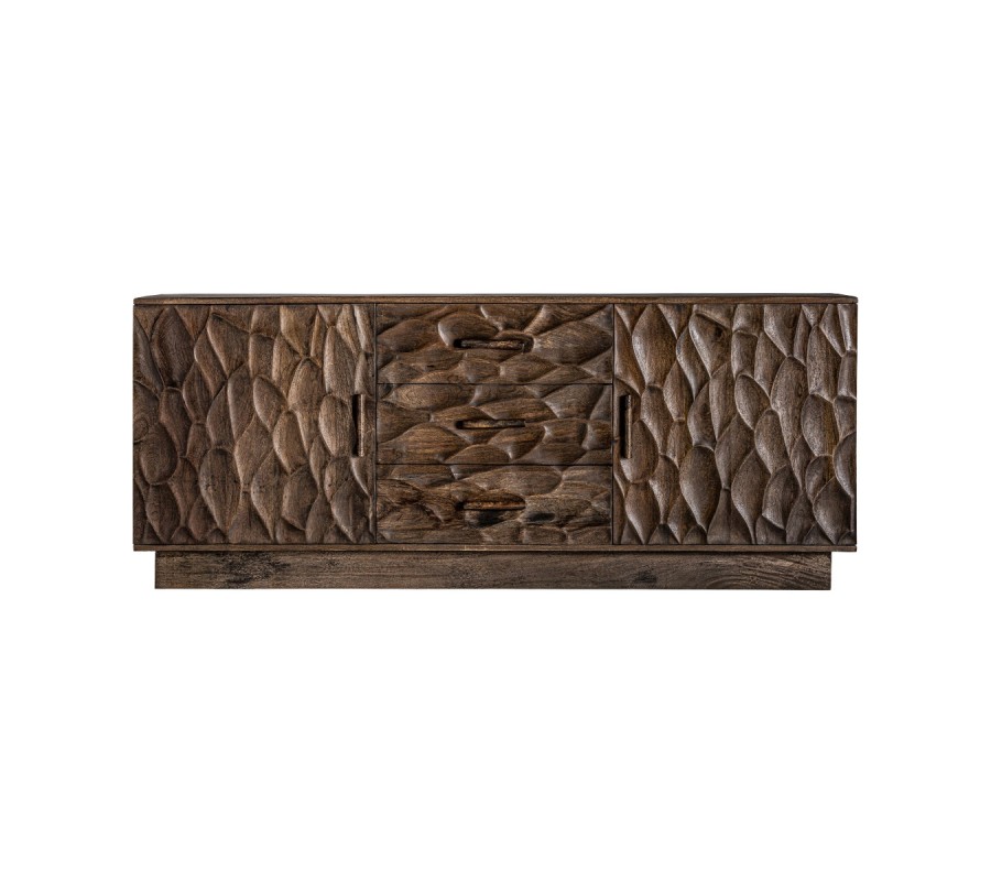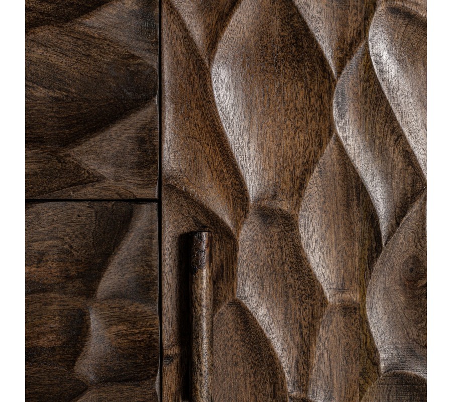 Dizajnový a nadčasový príborník z rady Lalique je vyrobený z kvalitného mangového masívu v príjemnom tmavom odtieni karobovej hnedej farby. Priestranný príborník Lalique disponuje množstvom úložného priestoru v podobe dvojdverovej skrinky a troch zásuviek, na ktorých sú zasadené horizontálne i vertikálne rukoväte valcovitého pozdĺžneho tvaru, rovnako tak disponujú i vkusným reliéfom na prednej strane. Príborník Lalique je postavený na zúženej masívnej plnej podstave, ktorá ho vyvyšuje a opticky v priestore nadnáša a odľahčuje. Vkusný príborník Lalique odporúčame v rámci moderných art-deco jedální alebo kuchýň či vo forme skrinky v rámci obývačiek či predsiení kombinovať najmä s dekoráciami a kobercami výrazných farieb a s luxusnými zlatými dekoráciami.