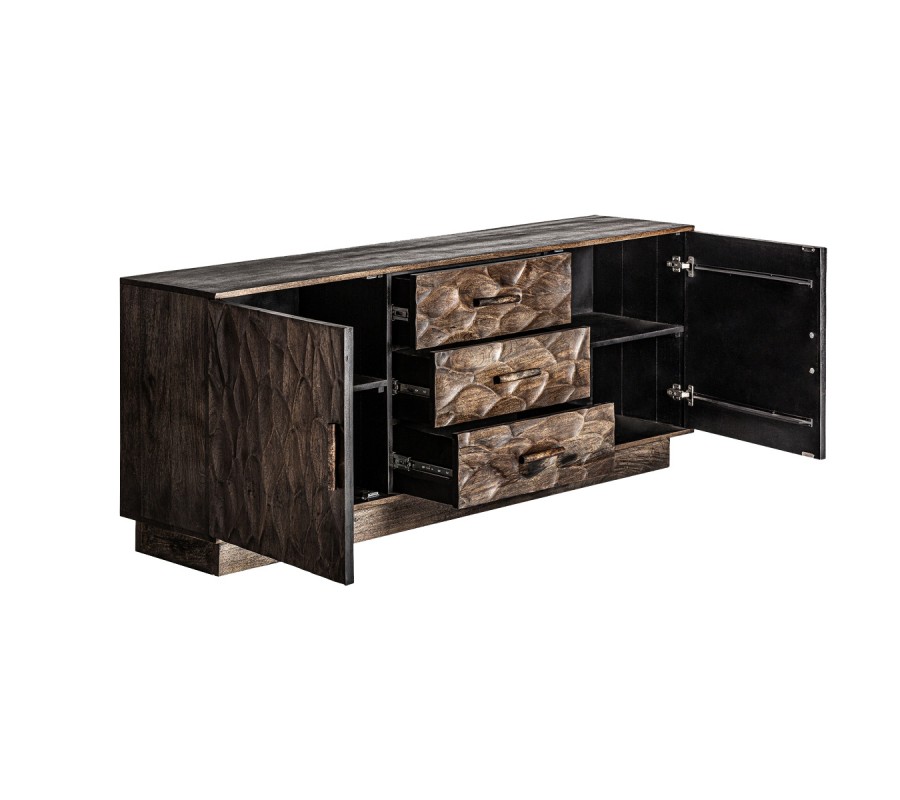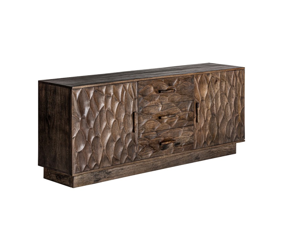 Masívny moderný hnedý obdĺžnikový príborník Lalique s tromi zásuvkami na podstave z mangového masívu 180cm