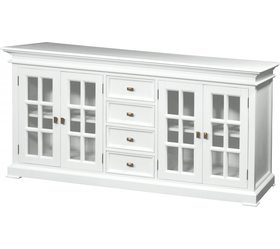 Luxusný rustikálny biely príborník Belliene z mahagónového masívu so štyrmi zásuvkami a dvomi sklenenými dvierkami 183cm