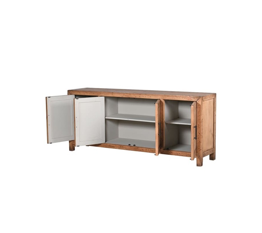 Príborník Emilio predstavuje luxusný a kvalitný kúsok vyrobený z masívneho dreva. Nesie sa v prírodnej svetlohnedej farbe a vo svojom dizajne prepája elegantné jednoduché tvary s nádychom vidieckeho štýlu. Drevo príborníka svojou špecifickou povrchovou úpravou dosahuje efekt starého nábytku vo forme štýlových dierok po drevokaznom hmyze a zdanlivo opotrebovaných hrán, vďaka čomu vzniká jedinečný vintage starožitný nádych. Príborník disponuje bohatým úložným priestorom v podobe poličiek so štyrmi dvierkami. Na dvierkach je drevo obohatené o zaujímavú povrchovú úpravu vytvárajúcu efekt parketových dosiek. Dvierka dopĺňajú štýlové matné tmavé kovové rukoväte. Príborník tak získava unikátny vidiecky vzhľad, ktorý príjemne doplní priestory obývačky či jedálne štýlových zrubov a dreveníc, kde umocní vidiecky vzhľad. Možno ho však umiestniť aj do modernejších, svetlých interiérov, kde vytvorí nádhernú kombináciu s ďalšími masívnymi kúskami ako napríklad vitrína Emilio.