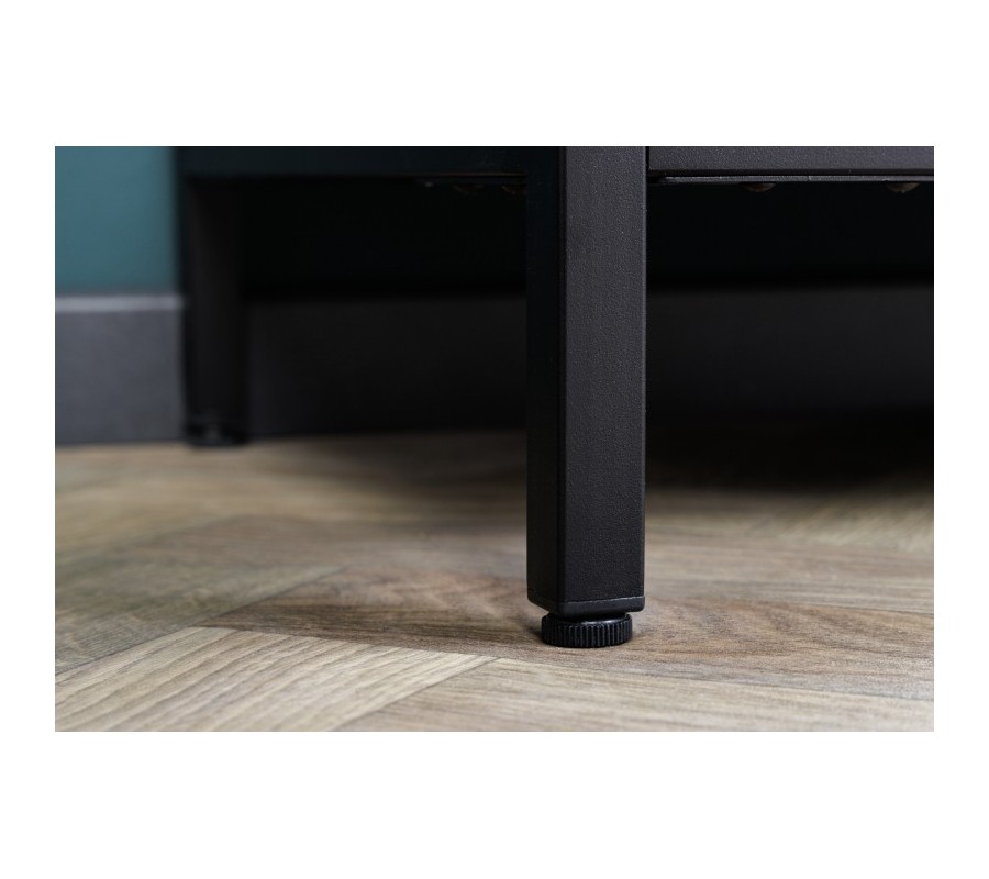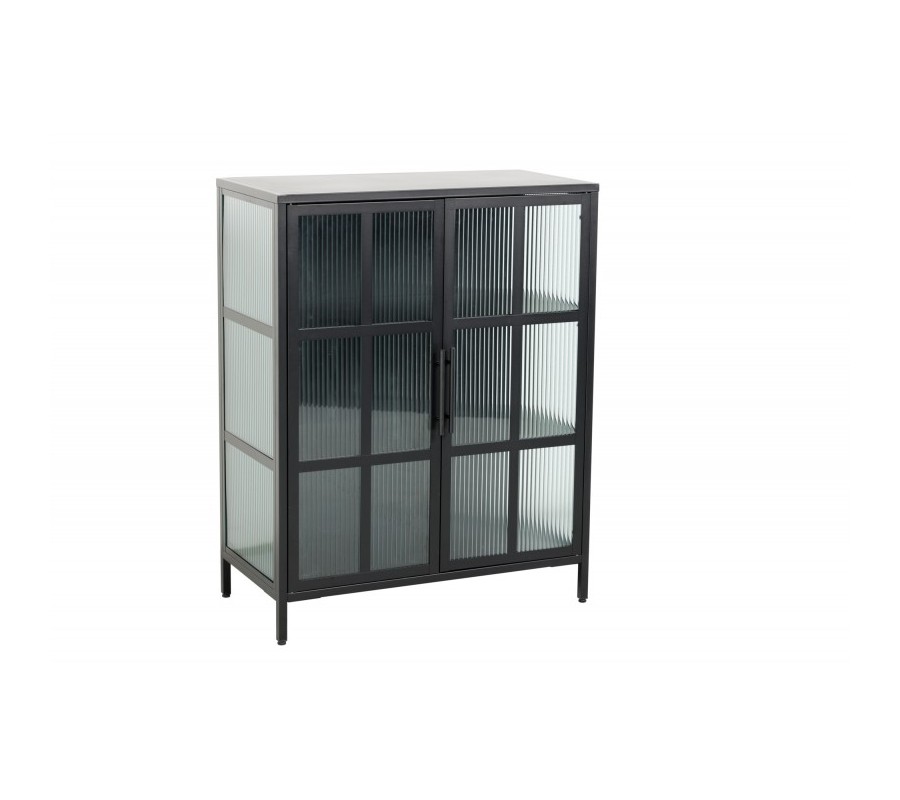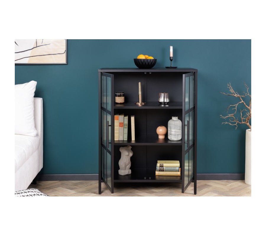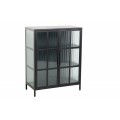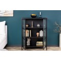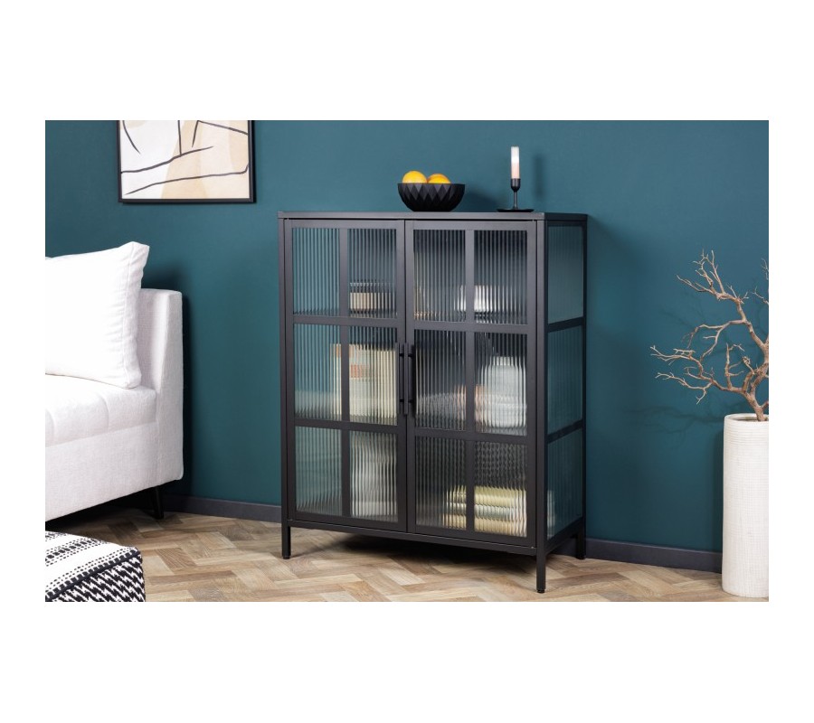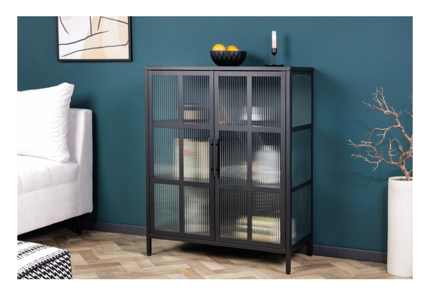 Dizajnová industriálna nízka vitrína Industria Durante z kovu s dvierkami z rebrovaného skla čierna 102cm