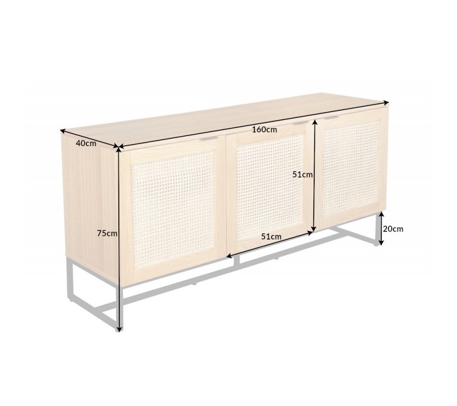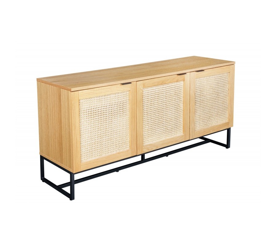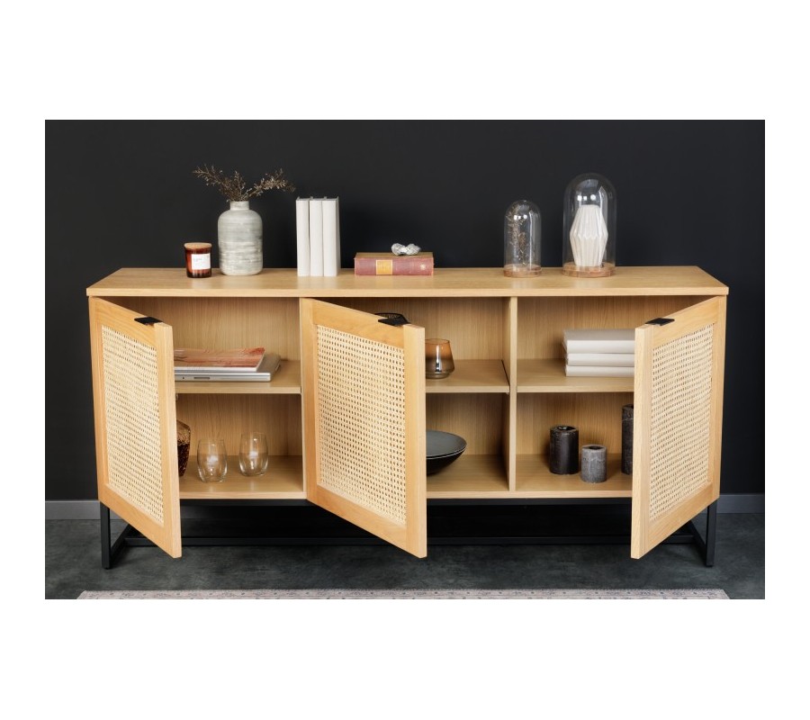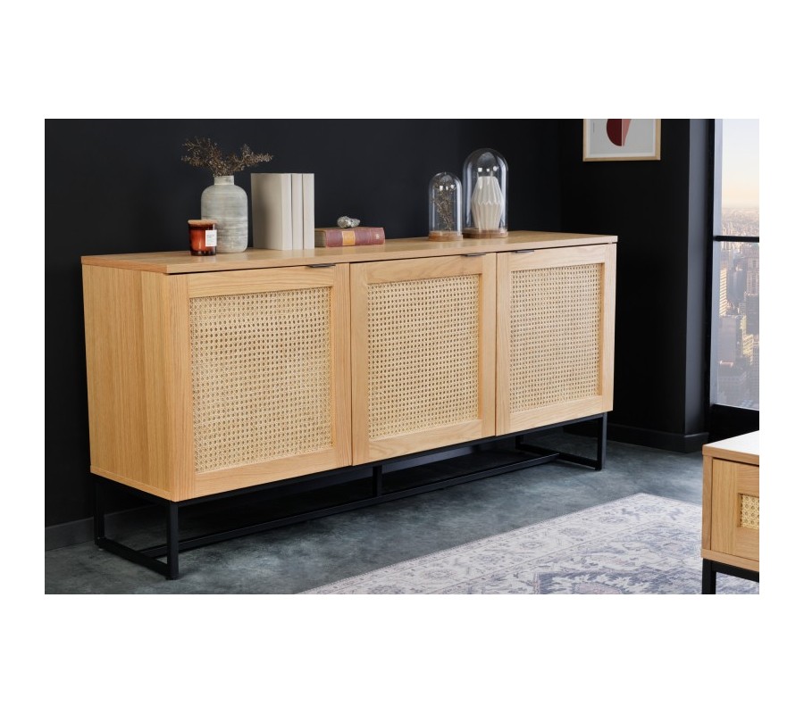 Elegantný príborník Vierata zaujme svojím dizajnom prepájajúcim moderný vzhľad s prvkami vidieckeho štýlu. Jeho konštrukcia kombinuje prírodný drevený materiál s industriálne pôsobiacim kovom vytvárajúcim nadčasový moderný nádych. Telo z dreva sa nesie v svetlohnedej prírodnej farbe, pričom povrchovú úpravu zdobí nádherná dubová dyha s viditeľnou prirodzenou kresbou. Príborník disponuje poličkami s tromi dvierkami, ktoré sú zdobené štýlovým viedenským ratanovým výpletom vytvárajúcim vidiecky efekt. Viedenský výplet patrí medzi klasiku v interiérovom dizajne, dnes však zažíva návrat a stretávame sa s ním aj pri zariaďovaní moderných priestorov. Príborník Vierata možno tak doplniť nielen do etno či vidiecky ladených, ale aj moderných priestorov obývačiek či jedální. Vynikne v kombinácii s masívnym alebo kovovým nábytkom a doplnkami v svetlých prírodných odtieňoch.