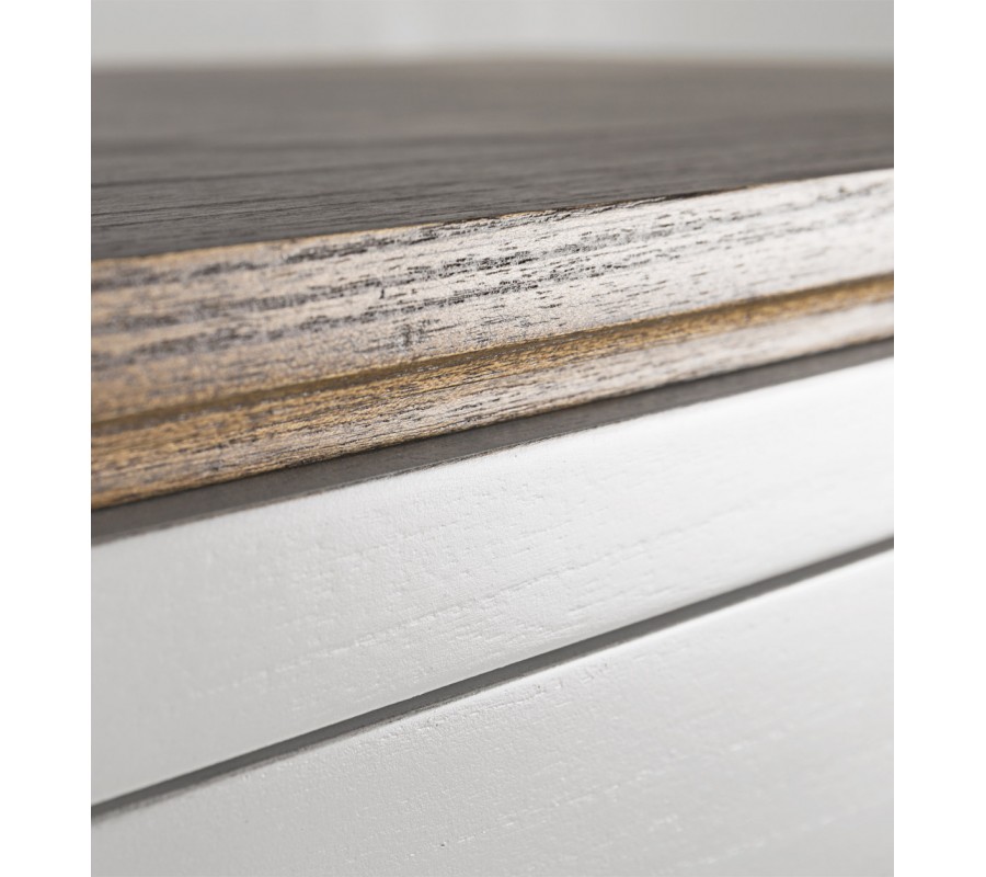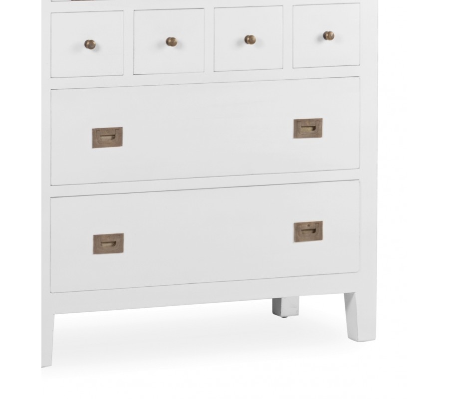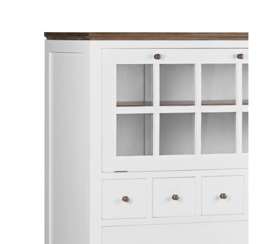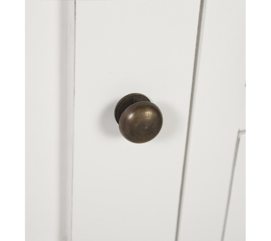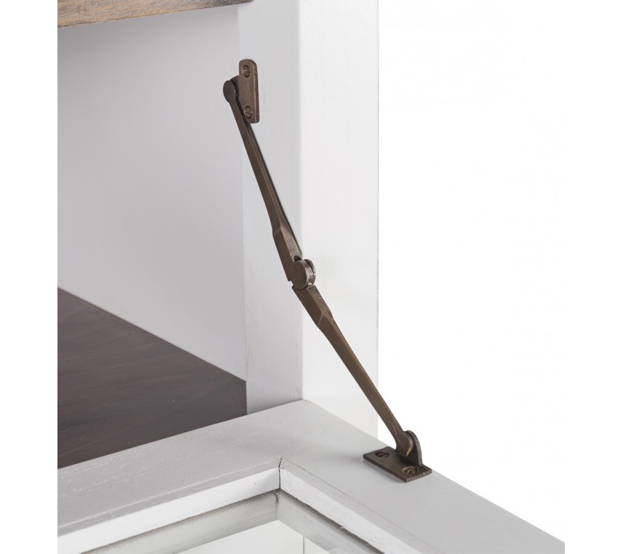 Luxusný kredenc Blanc je rovnako ako všetok nábytok z tejto exkluzívnej kolekcie vyrobený z masívneho dreva mindi. Drevo mindi sa vyznačuje svojou odolnosťou a nábytku tak zaručuje dlhú životnosť a prvotriednu kvalitu. Predstavuje zároveň materiál typický pre výrobu nábytku v koloniálnom štýle, ktorého prvky možno nájsť aj v dizajne kredenca Blanc. Kredenc jednoduchých tvarov sa nesie v bielom prevedení s hladkým povrchom, ktorý dopĺňa vrchná doska a poličky v prírodnej hnedej farbe. Ponúka bohatý úložný priestor v podobe šiestich zásuviek a dvoch poličiek s vyklápacími dvierkami, čo zaručuje dostatok miesta odhliadnuc od miestnosti, do ktorej ho umiestnite. K bielemu telu kontrastne pôsobia aj bronzové kovové úchyty na dvierkach a zásuvkách. Kredenc Blanc vhodne doplní koloniálne a klasicky ladené priestory obývačiek alebo jedální, kde v kombinácii s ďalšími kúskami tejto kolekcie vytvorí luxusný dojem.