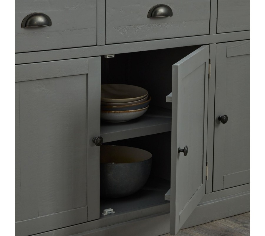 Elegantný príborník Greytone sa vyznačuje svojimi elegantnými líniami a prevedením v provensálskom štýle. Je vyrobený z kvalitného masívneho dreva a okrem inovatívneho dizajnu ponúka bohatý úložný priestor v podobe poličiek s tromi dvierkami a troch zásuviek. Teplá sivá povrchová úprava je kombinovaná s povrchovou doskou v prírodnej hnedej farbe s jemnou naturálnou kresbou a patinou vytvárajúcou efekt opotrebovania. Dizajn príborníka Greytone, rovnako ako aj ďalších kúskov z tejto kolekcie, prepája estetiku súčasného moderného interiérového dizajnu s prvkami provensálskeho štýlu, čím vzniká elegantný kúsok vhodný pre širokú škálu domácností. Mosadzné úchyty dotvárajú celkový dizajn a príjemne kontrastujú so sivým dreveným povrchom. Príborník je tak univerzálnym, nadčasovým a trvácnym kúskom, ktorý vynikne v provensálsky, rustikálne a vidiecky ladených spálňach, ale i v modernejších priestoroch, kde dotvorí unikátny nádych domova a útulnej atmosféry. Pre zosúladenie vašich priestorov odporúčame príborník kombinovať aj s ďalšími kúskami z kolekcie Greytone, ako napríklad so štýlovou komodou či elegantným TV stolíkom. Vhodné sú tiež textílie v pastelových odtieňoch a doplnky z prírodných materiálov.