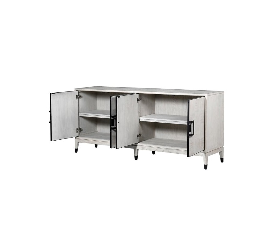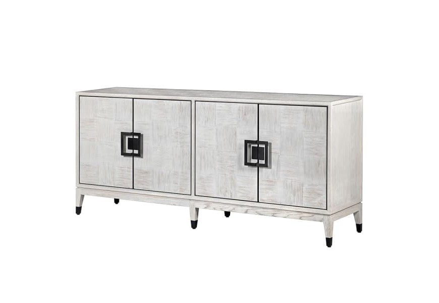 Masívny príborník Quadria Blanca zaujme svojím elegantným vzhľadom v modernom štýle. Vyznačuje sa najmä využitím čistých línií a jednoduchých geometrických tvarov, vďaka čomu vzniká nadčasový dizajn. Príborník je vyrobený z kvalitného masívneho dubového dreva s off white povrchovou úpravou a vďaka jeho zvýraznenej prirodzenej kresbe získava príjemný naturálny nádych. Povrch je zároveň obohatený o zaujímavý šachovnicový vzor tvorený rôznymi smermi vlákien dreva. Ponúka úložný priestor v podobe štyroch priestranných poličiek s dvomi dvojicami dvierok. Dvierka dopĺňajú elegantné kovové úchyty čiernej farby, ktoré vytvárajú štýlový štvorcový tvar. K úchytom tiež ladia jednoduché čierne prvky na spodnej časti nožičiek. Elegantným a nadčasovým dizajnom príborníku Quadria Blanca vkusne doplníte moderné jedálne či obývačky. Kombináciou s jemnými svetlými naturálnymi farbami dosiahnete estetický nadčasový vzhľad, ktorý váš interiér krásne rozžiari. Odporúčame tiež kombináciu aj s ďalšími kúskami z kolekcie Quadria Blanca.
