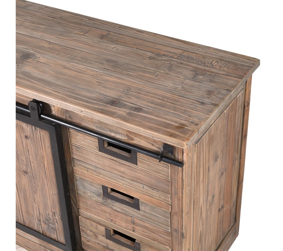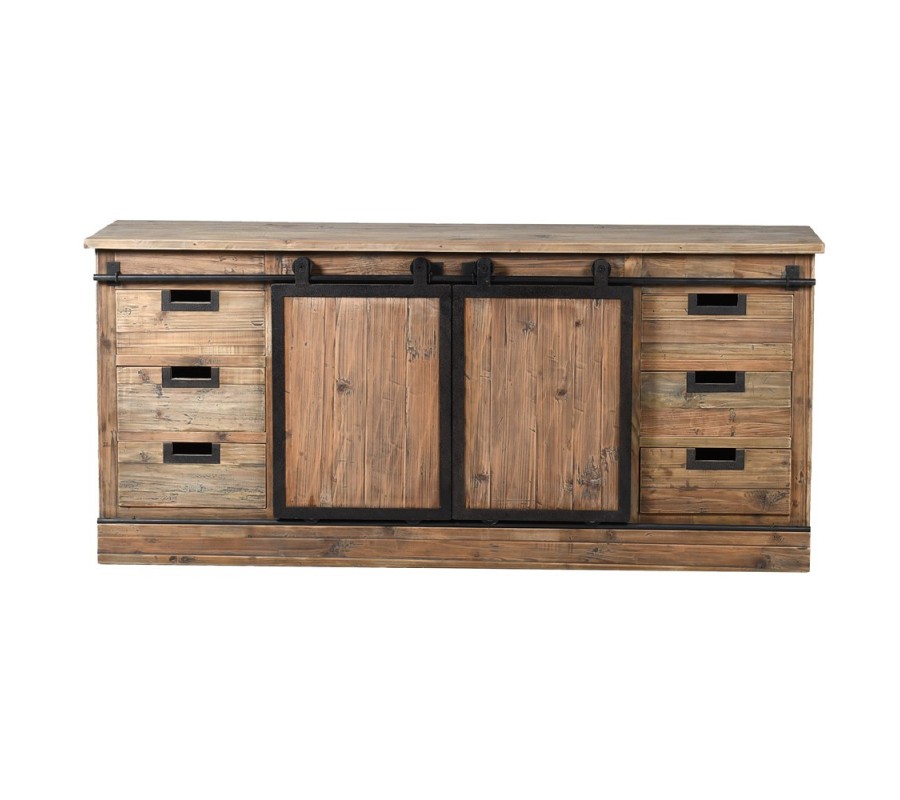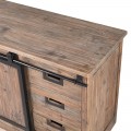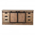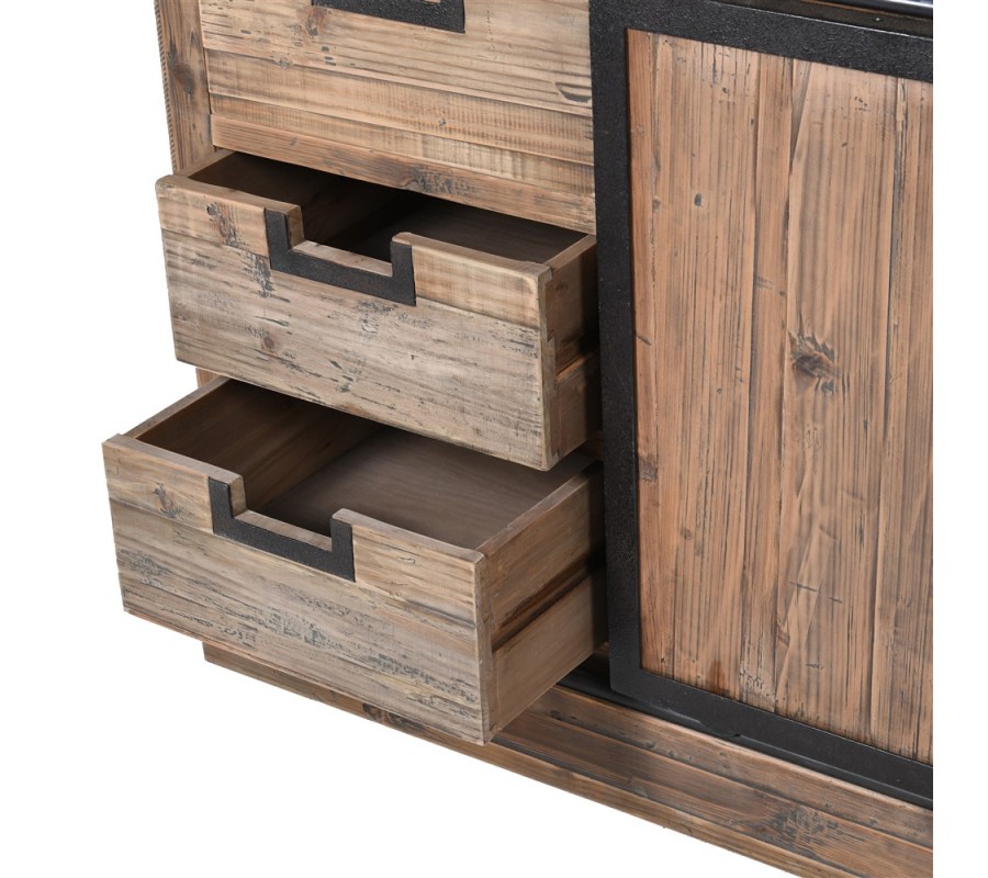 Luxusný príborník Impact v industriálnom štýle je lákadlom pre oči milovníkov masívneho nábytku s nádychom štýlu vintage, či vidieckého štýlu. Naturálny vzhľad industriálneho príborníku Impact je dosiahnutý vďaka vyhotoveniu z dubového masívneho dreva, obohateného o povrchovú dyhu, vyzdvihujúcu spomenutý prírodný vzhľad. Výrazná kresba dreva a ošúchaný vzhľad svetlo hnedej farby prispevajú ku spomenutému vidieckemu a vintage nádychu. Industriálny vzhľad je príborníku Impact je dosiahnutý kombináciou dubového dreva a čiernych kovových prvkov v podobe dvierok s čiernym rámom z kovu, ktoré fungujú na veľmi nevšedný, no praktický koľajový mechanizmus. Úložný priestor príborníku je taktiež obohatený o šesť zásuviek s čiernym kovovým úchytom. Industriálny príborník Impact odporúčame kombinovať v industriálnych alebo vidieckych interiéroch s podobným masívnym nábytkom a dekoráciami, a taktiež s jedálenskými stoličkami s čiernymi kovovými nožičkami.