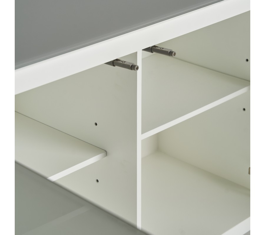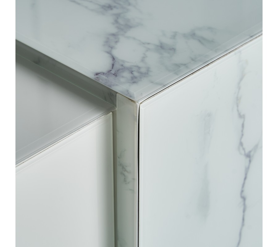 Doprajte si luxusný kúsok do Vašej modernej jedálne. S jedinečným príborníkom Neva Marble prinesiete luxus, eleganciu a nadčasový vzhľad do interiéru. Moderný príborník Neva Marble disponuje unikátnym dizajnovým prevedením, ktoré ponúkne matné biele vyhotovenie, doplnené vyvýšenými bočnými stranami zo skla. Sklenené bočné strany príborníku disponujú mramorovým vzhľadom, ktorý v kombinácií s kovovými nožičkami v zlatej farbe vytvorí extravagantný luxusný dizajn v modernom štýle. Vyšperkovanú dizajnovú stránku príborníka Neva Marble doplní praktický vnútorný úložný priestor z dreva, ktorý je chranený štyrmi dvierkami. Vo vnútri príborníka sa nachádzajú štyri police, vďaka čomu sa zaručene nájde dostatok priestoru pre uloženie rôzneho náradia a iných potrieb. Luxusný vzhľad príborníka Nueva Marble vynikne so zlatými doplnkami a dekoráciami v moderných bielych jedálňach.