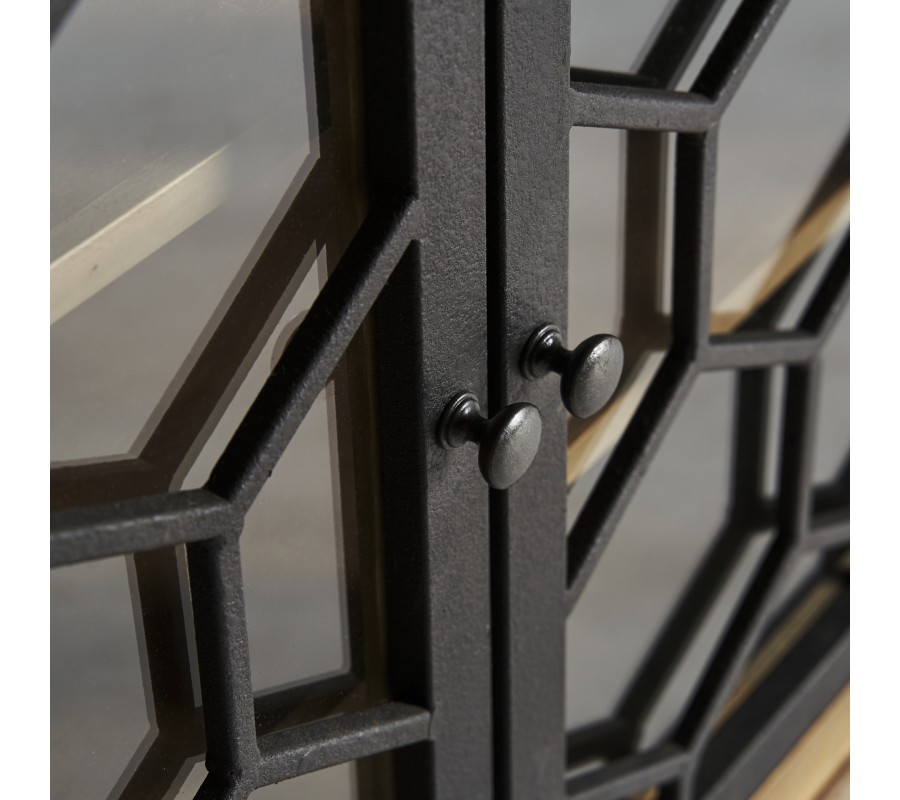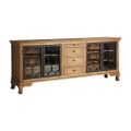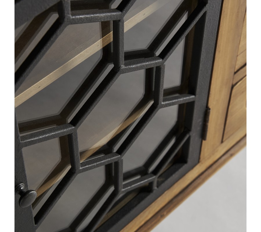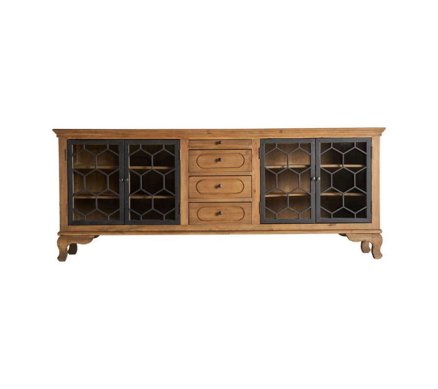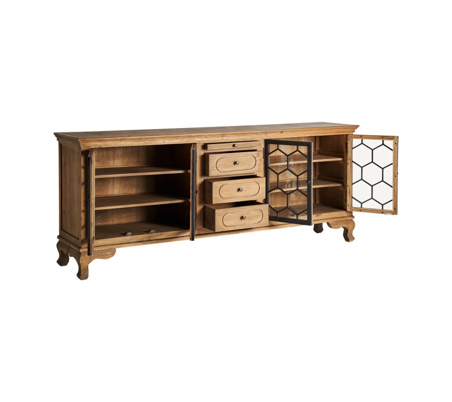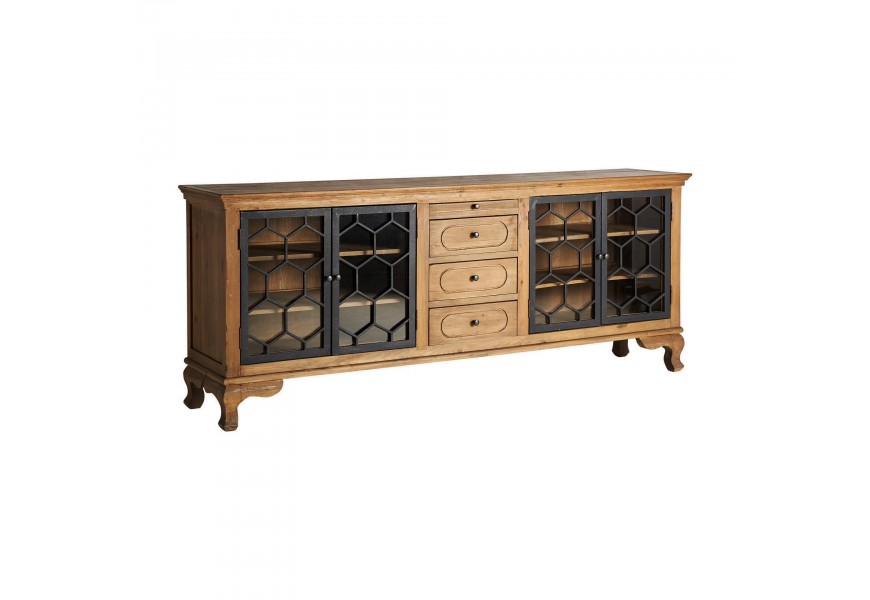 Luxusný príborník z kolekcie masívneho nábytku Lavia Pine Vám prináša krásny kúsok v podobe rovnomenného príborníka, ktorý doplní vidiecky, či industriálne zariadené jedálne. Príborník Lavia Pine Vám ponúkne jedinečný dizajn, ktorému dominuje kvalitné drevené vyhotovenie z hnedého recyklovaného borovicového masívu, ktorý svojím povrchom v naturálnom prevedení doplní prírodný vzhľad do Vášho interiéru. Dizajnový vzhľad príborníka taktiež umocňujú tvarované nožičky v rustikálnom štýle, ručné vyrezávanie na bočných stranách, a taktiež sklenené dvierka chránené čiernym kovovým dekorom v tvare šesťuholníkov. Praktická stránka taktiež disponuje štyrmi zásuvkami s tmavosivými kovovými rukoväťami vo vintage štýle a štyrmi vnútornými poličkami. Vďaka kovovému prevedeniu dvierok vzniká možnosť kombinácie s industriálnymi doplnkami, alebo taktiež aj s rustikálnym a vidieckym masívnym nábytkom.