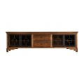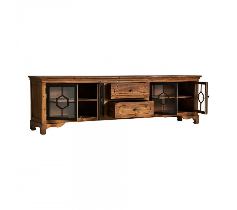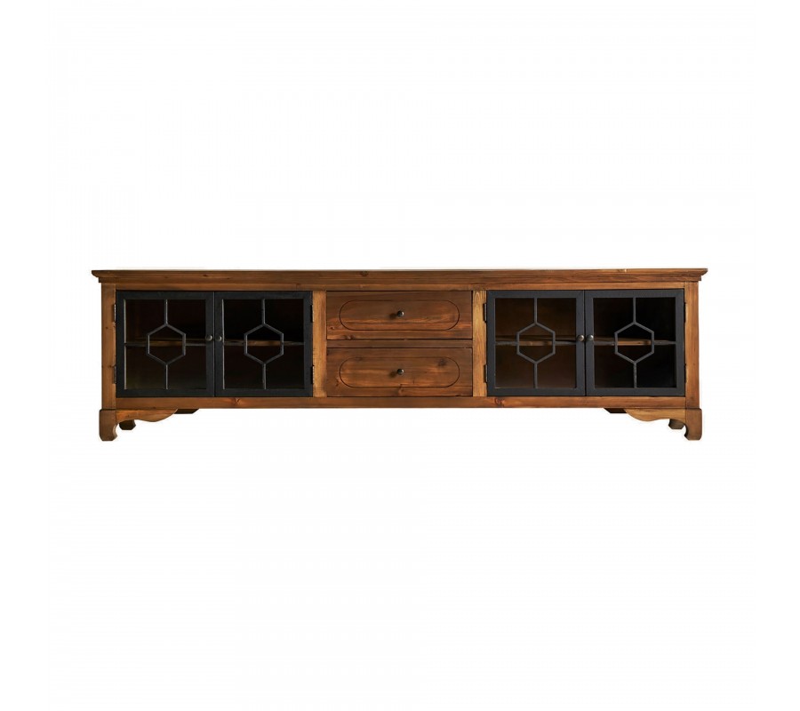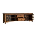 Vidiecky hnedý TV stolík Lavia Pine z masívu so železnými presklenými dvierkami a dvomi zásuvkami 220cm