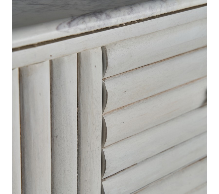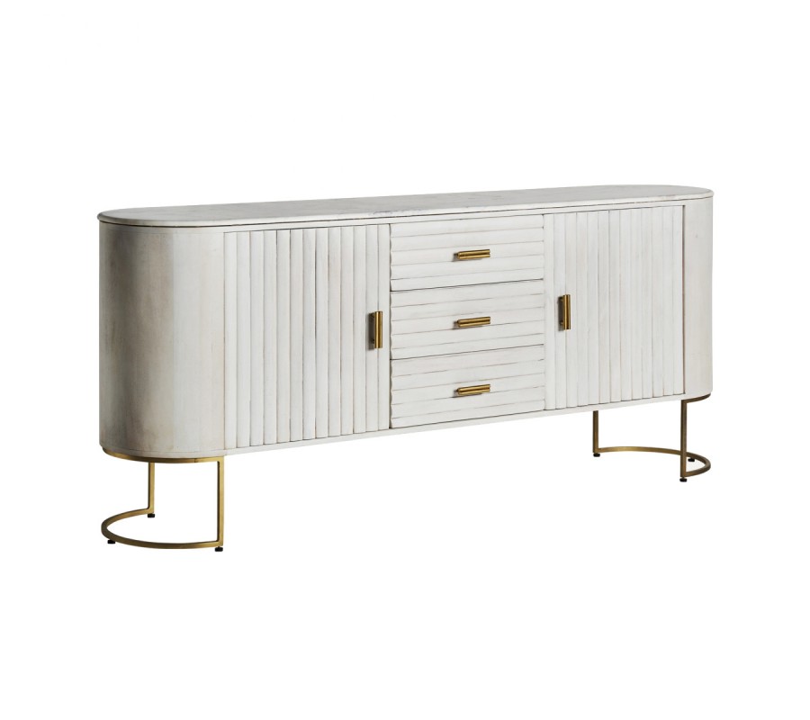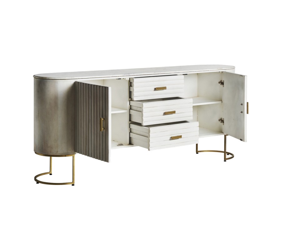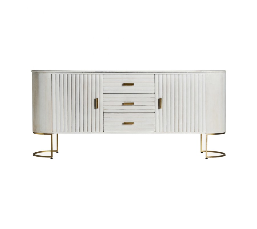 Luxusný príborník Sedge sa nesie v žiarivej bielej farbe a do vášho interiéru vnesie honosný glamour nádych. Jeho dominantou je štýlový oválny tvar, ktorým upúta pozornosť a zároveň zaoblené línie pôsobia vysoko elegantným efektom. Príborník je vyrobený z masívneho mangového dreva a jeho žiarivobiela povrchová úprava mu dodáva nádych luxusu. Drevené telo je doplnené podstavou z kovu v zlatej farbe dotvárajúcou art deco vzhľad. Rovnaké zlaté prvky nájdete využité aj na úchytoch troch zásuviek a dvoch okrajových dvierok, ktoré vám poskytnú bohatý úložný priestor. Kombinácia farieb, materiálov a elegantných tvarov a línií vytvára honosný vzhľad, ktorý vašej jedálni či obývačke dodá luxusný nádych v štýle art deco. Nádhernú kombináciu vytvorí s výraznou zamatovou čalúnenou sedačkou či kreslom, skleneným jedálenským alebo konferenčným stolíkom a zlatými doplnkami z kovu.