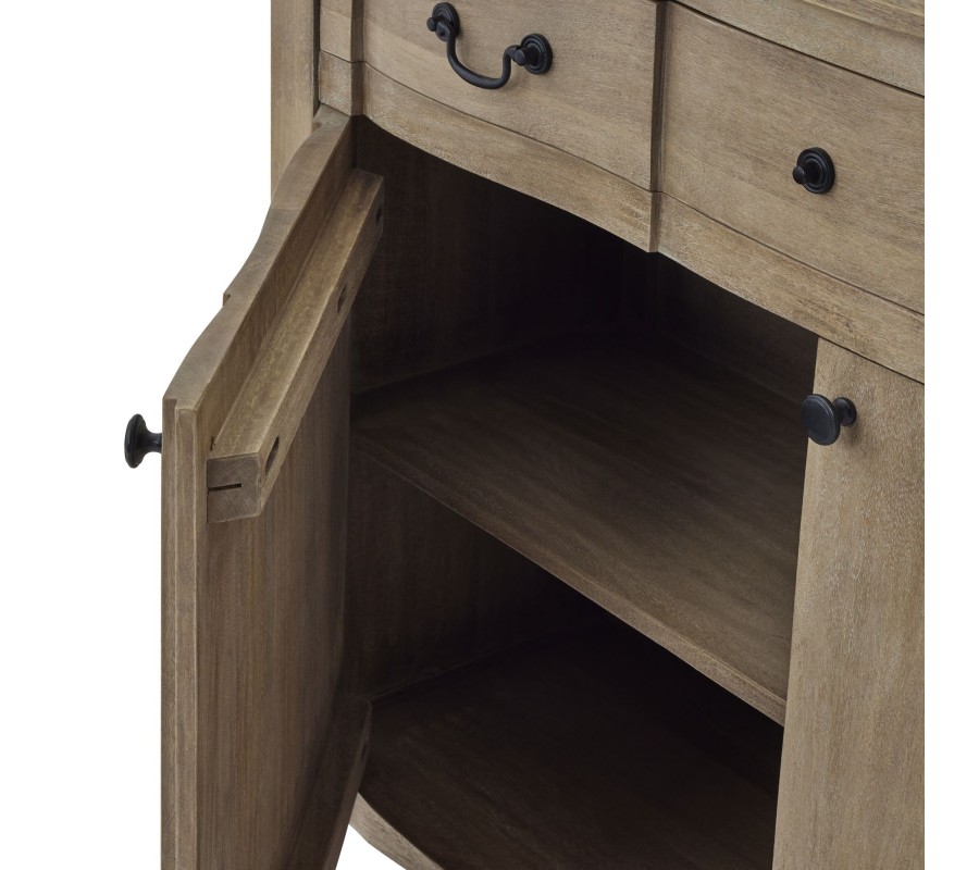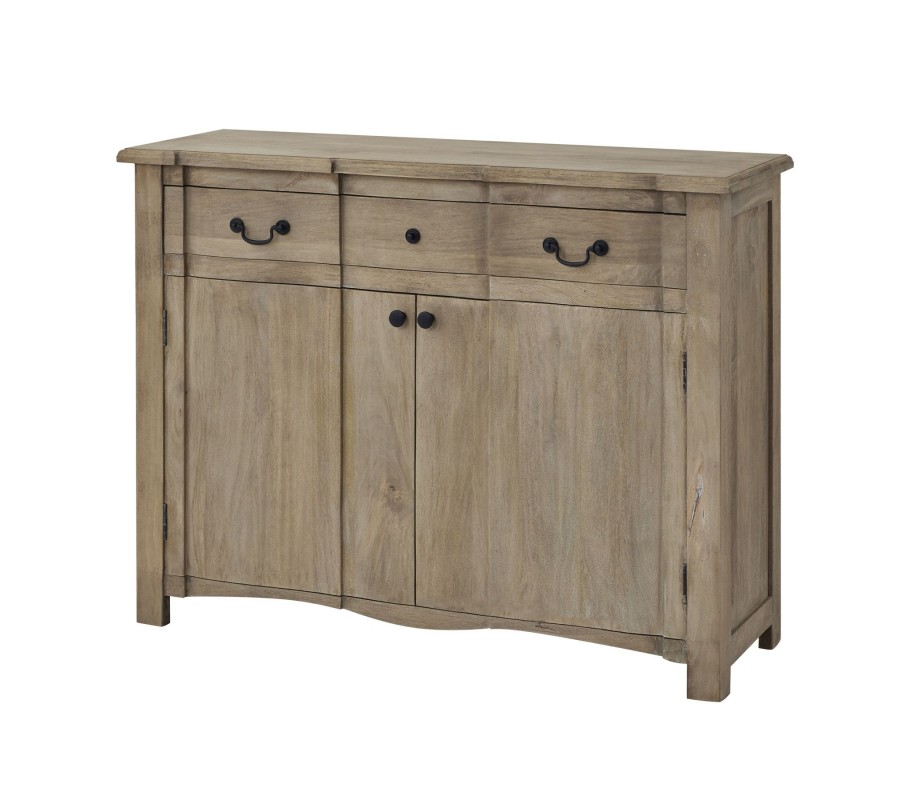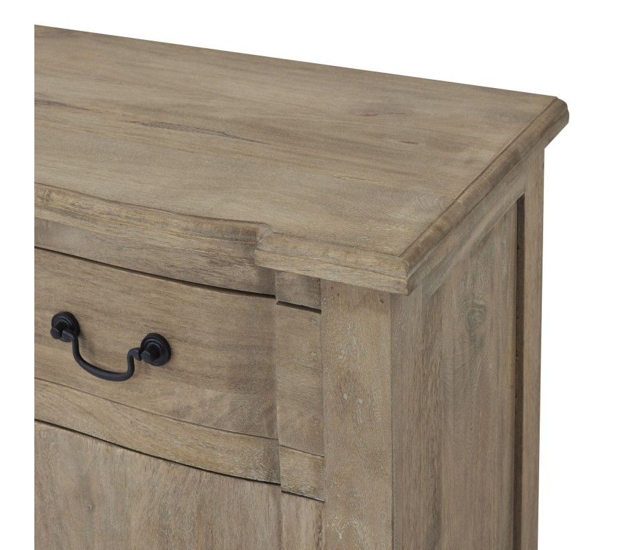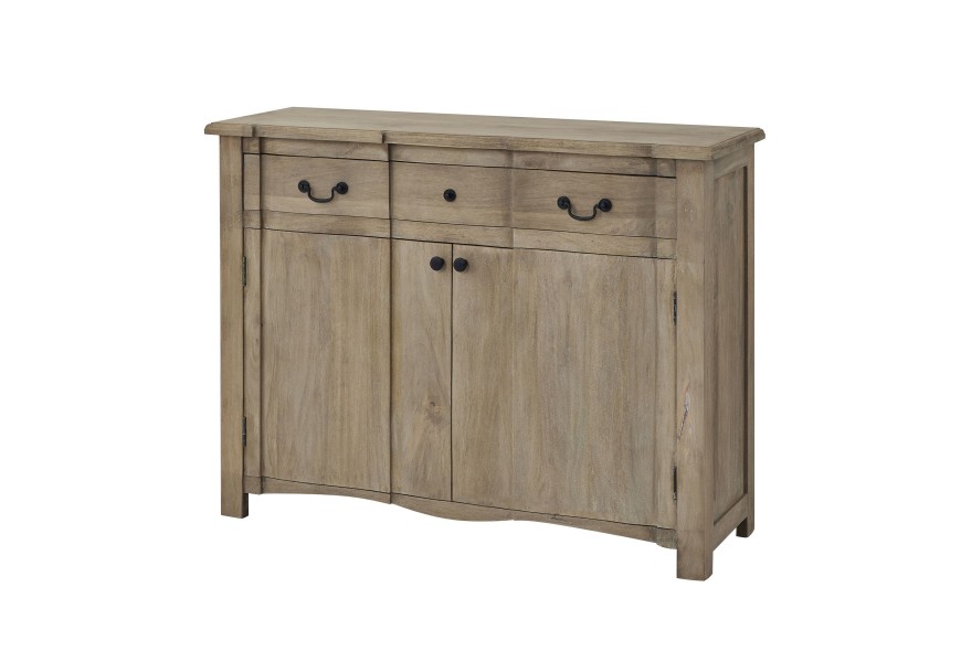 Vidiecky masívny príborník Fratemporain hnedej farby so zásuvkami a dvierkami s rustikálnym vyrezávaním 120cm
