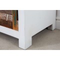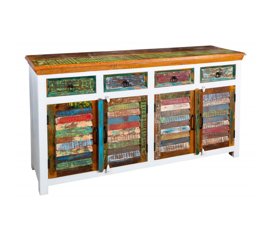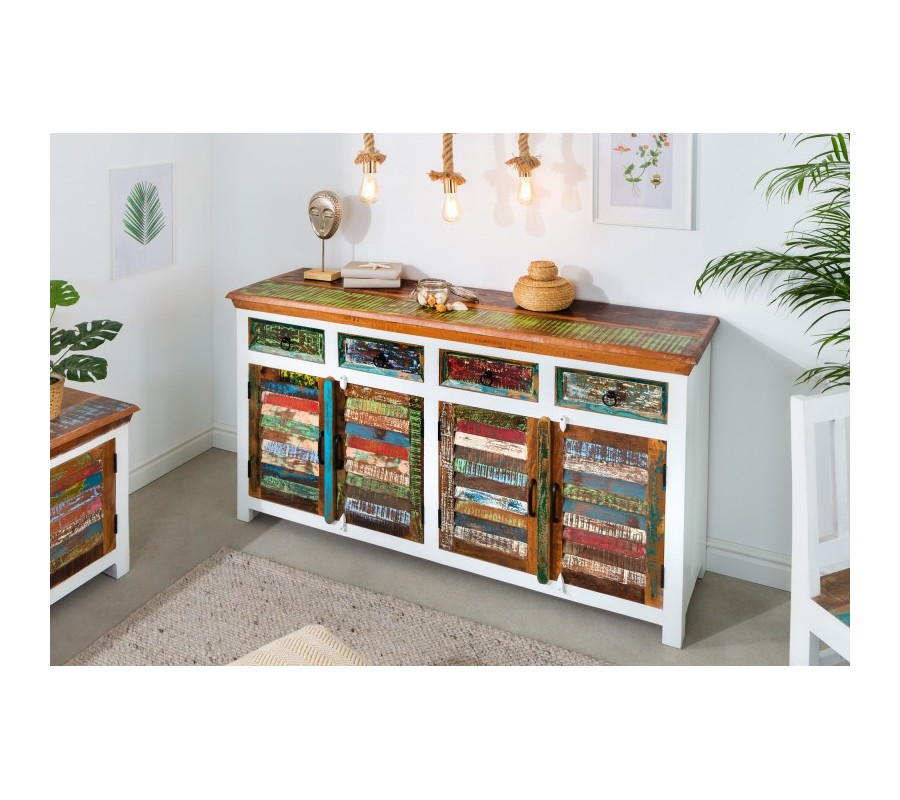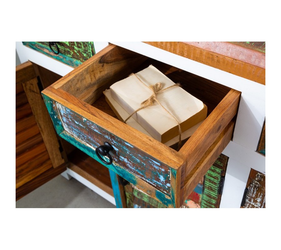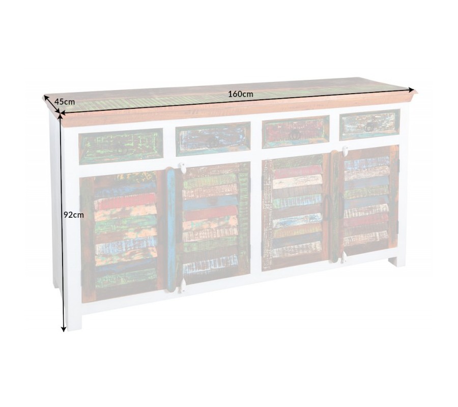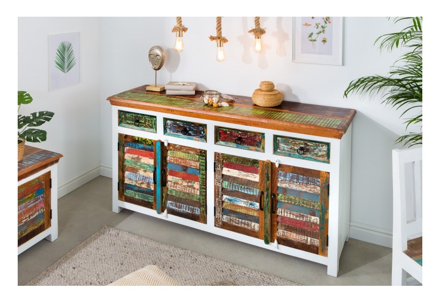 Štýlový príborník z kolekcie Jakarta upúta pozornosť nádherným pestrofarebným prevedení v odtieňoch zelenej, červenej a modrej farby evokujúcej bujarú atmosféru južanských krajín spätú s výnimočným temperamentom a pôžitkárstvom. Konštrukcia je vyrobená z kvalitného mangového masívu, ktoré je povrchovo upravené farbenými nátermi a lesklým finišom. Zásuvky a dvierka sú vložené v bielom ráme. Naozaj štedré rozmery príborníka ponúkajú veľký úložný priestor vo forme štyroch vrchných zásuviek a štyroch dvierok uzavierajúcich vnútorný úložný priestor. Dvierka disponujú kovovými úchytmi v čiernej farbe. Príborník Jakarta vo vintage koloniálnom štýle dokonale zažiari v etno koloniálnych priestranných jedálňach, kde prežiari miestnosť vďaka svojej farebnosti. Mangové drevo je spracováné ručne, a tak je každý jeden kus nezameniteľným originálom. Povrchová úprava obsahuje efektné ošúchané miesta, hrbolčeky či malé praskliny.
