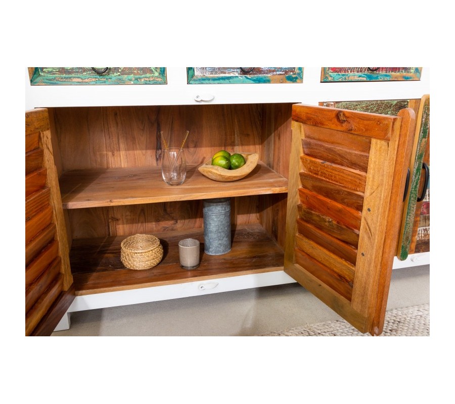 Vintage príborník Jakarta s koloniálnym nádychom z mangového dreva v pestrofarebnom prevedení s lakovaným povrchom 160cm