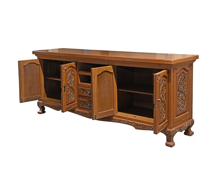 Nechajte sa vniesť do atmosféry magického orientu a doprajte si luxusný kúsok zariadenia! Použitý masív v tmavohnedej koňakovej farbe zrkadlí luxusné a mysteriózne vyhotovenie príborníka, ktorý je bohato zdobený vyrezávanými aplikáciami na dvierkach uzatvárajúcich vnútorný úložný priestor. Silueta obdĺžnikového tvaru príborníka necháva vyniknúť oblé tvary spodnej lišty. Príborník disponuje štedrými rozmermi, a tak poslúži ako praktický pomocník na úschovu vašej obedovej súpravy či iných potrebných vecí na stolovanie. Vďaka orientálne ladenému dizajnu sa bude výborne hodiť do priestranných jedální zariadených v orientálnom či etno štýle. Svoje miesto si nájde v kombinácii s výraznými tkanými kobercami a závesmi v bordovej, zlatej či olivovo zelenej farbe so strapcami. Môžete ho doladiť k masívnym vitrínam, stolom či jedálenským stoličkám.