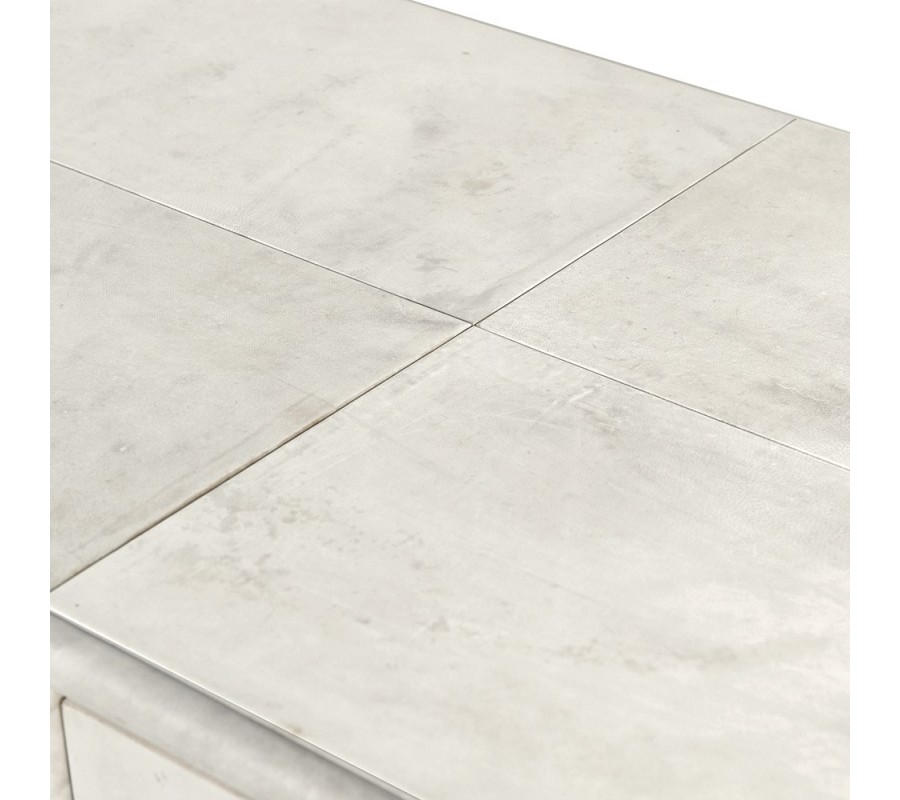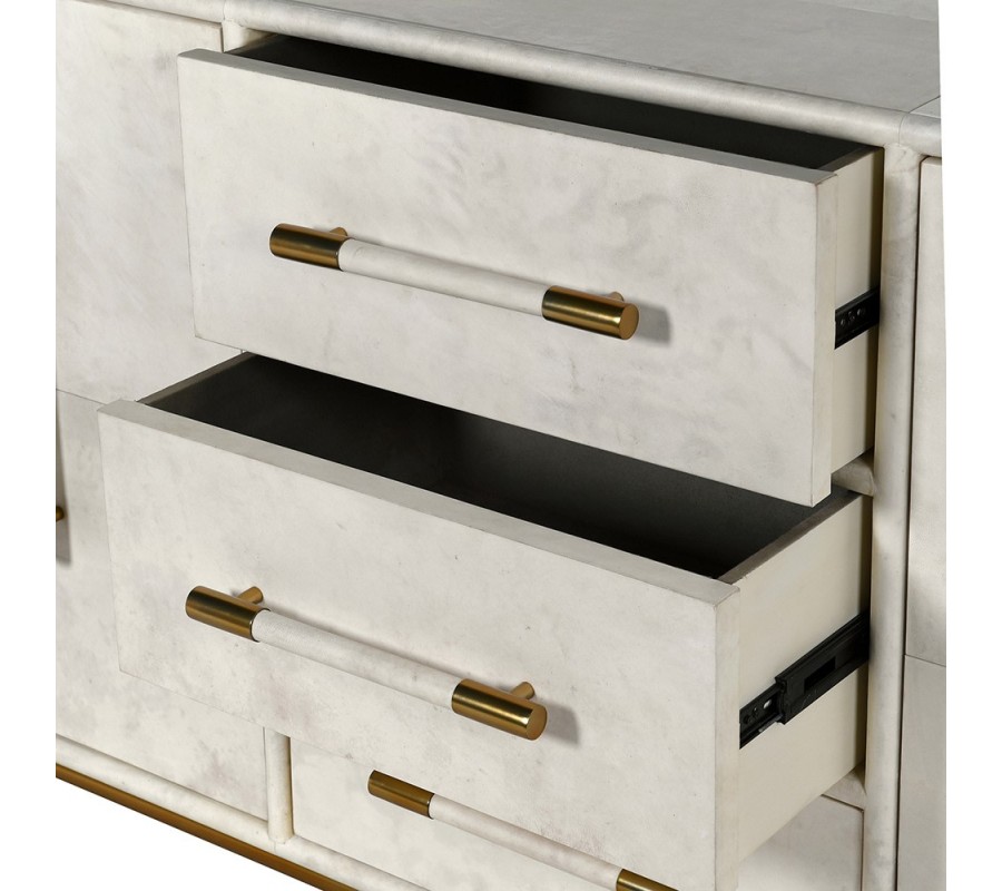 Exkluzívny príborník Pellia Marble už na prvý pohľad zaujme svojím unikátnym vzhľadom. Jeho telo disponuje luxusným poťahom z pravej kože v elegantných odtieňoch bielej a krémovej s mramorovým efektom. Tento luxusný vzhľad dopĺňa kovová konštrukcia v žiarivej zlatej farbe, vďaka čomu príborník dostáva nezameniteľný nádych art-deco štýlu. Po stranách sa nachádzajú dve dvojice dvierok zdobených elegantnými zlatými rukovúťami, ktoré poskytujú úložný priestor v podobe priestranných poličiek. V strednej časti sa nachádzajú tri praktické zásuvky. Príborník Pellia Marble krásne doplní priestory art-deco ladených jedální či obývačiek. Pre dosiahnutie dokonalého luxusného vzhľadu odporúčame tiež kombináciu s ďalšími kúskami z tejto kolekcie a dekoráciami v zlatej farbe.