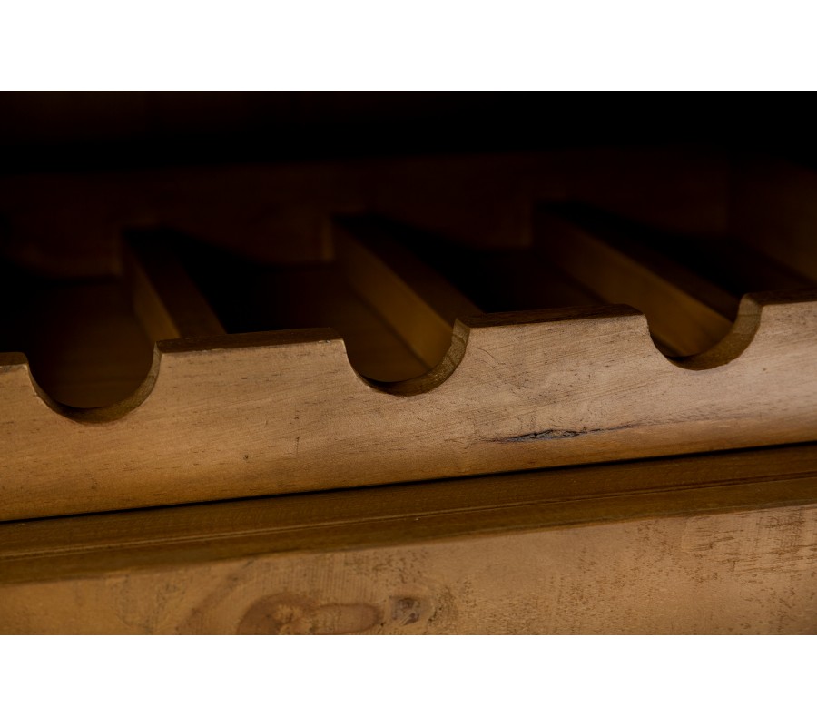 Thor nie je len o vzhľade; je aj o funkcionalite. Je ideálny na uloženie riadu a fliaš s vínom, vďaka čomu sa stáva skvelým doplnkom do obývačky alebo jedálne. S kapacitou pre 11 vínových fliaš, môžete mať svoju obľúbenú kolekciu vždy po ruke, pripravenú na oslavy alebo tiché večery doma. Mohutná ocelová konštrukcia kovových nožičiek po bokoch a zámerne vyniknuté šróby a matky v hornej doske dodávajú industralny nádych a vzhľad.