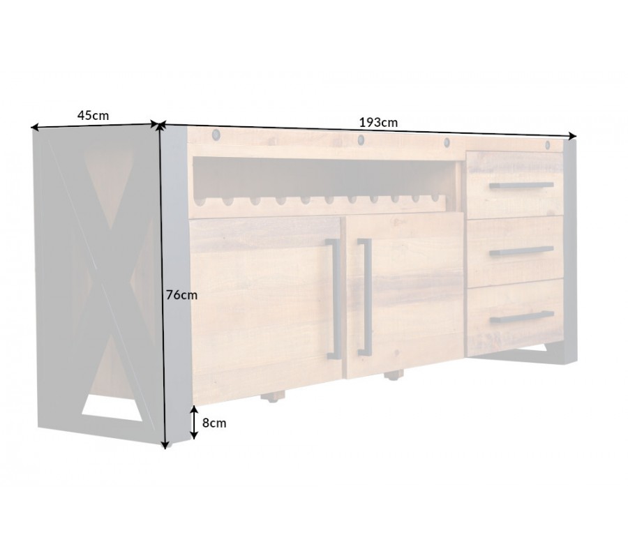 Industriálny príborník s vinotékou z masívu s čiernym oceľovým rámom Adin 195cm