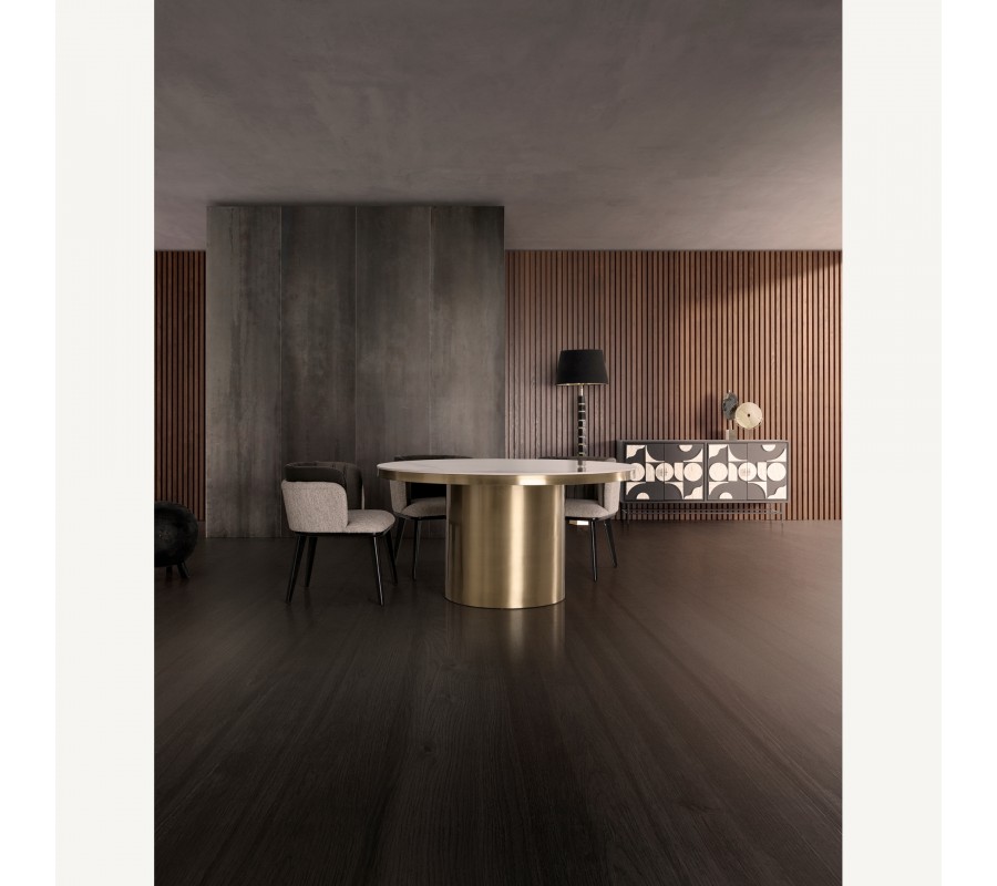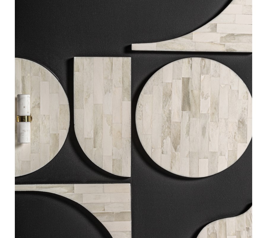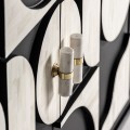 Luxusný príborník Vasilij bude výrazným vizuálnym prvkom vašej jedálne a zároveň očarí vašich hostí svojím jedinečným dizajnom pripomínajúcim avantgardné umelecké dielo. Je tvorený dvomi skrinkami, z ktorých každá je predelená policou, čím vzniká veľký úložný priestor na riady, poháre, fľaše, či textílie. Dvierka sa otvárajú pomocou valcovitej úchytky upevnenej zlatý kruhom, ktorý dodáva lesklý prvok. Ten v kombinácii s geometrickým motívom prináša do dizajnu estetiku art-deco štýlu. Vzor je tvorený kosťovou inkrustáciou v svetlej slonovinovej béžovej farbe, ktorá vytvára príjemný kontrast s čiernymi drevenými časťami. Príborník je postavený na štyroch štíhlych nožičkách, prepojených po obvode spojnicou. Príborník je vhodným doplnkom do priestorov zariadených v neutrálnych šedých a bielych odtieňoch, kde bude pôsobiť ako výrazný dekoračný prvok. Môžete ho tiež doplniť extravagantnými zlatými dekoráciami či farebnejšími prvkami, ktoré zvýraznia art deco charakter nábytku.