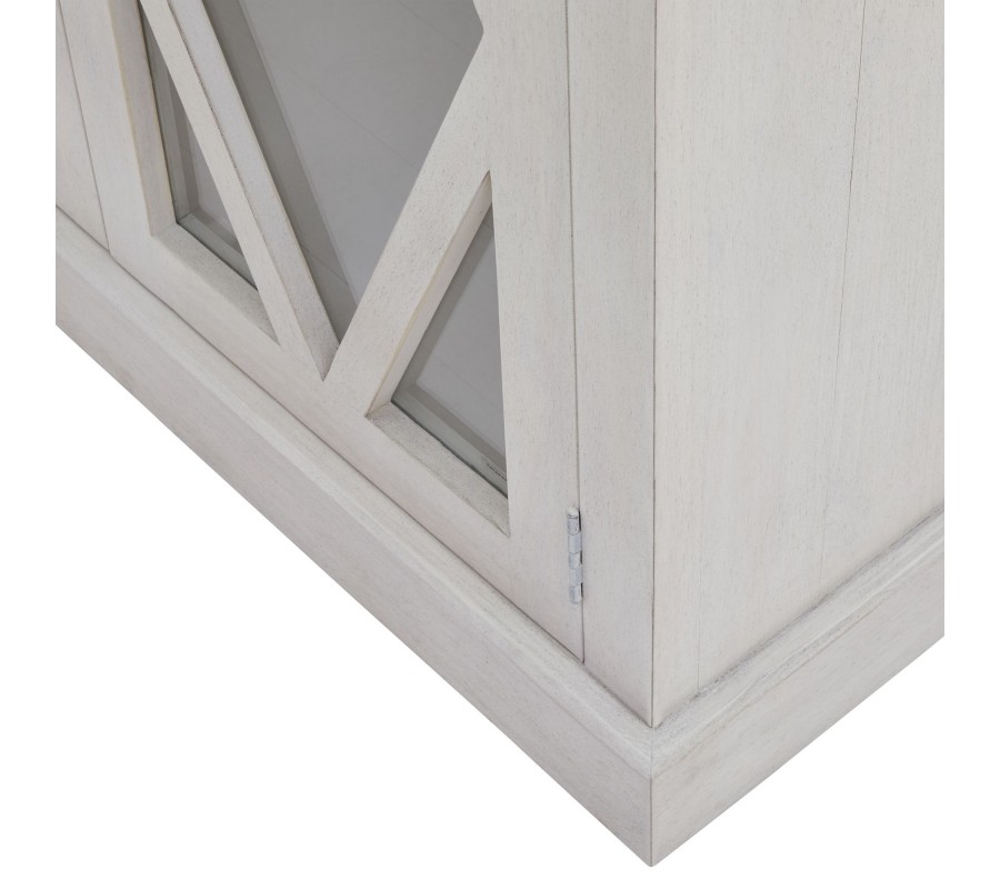Jeho multifunkčný charakter mu dáva výrazne širšie uplatnenie v interiéri. Môže slúžiť ako úložný priestor v kuchyni na uskladnenie riadu či potravín, ale rovnako dobre sa uplatní aj v obývačke ako úložný priestor na knihy, časopisy alebo ako priestor na vystavenie dekoratívnych prvkov. Dvierka sú vyrobené z tvrdeného skla a dpoplnené núdzovými kovovými rukoväťami. Ich elegantná dekorácia v podobe dreveného ornamentu s bielym náterom v tvare kosoštvorca im dodáva nádych vidieku.
