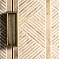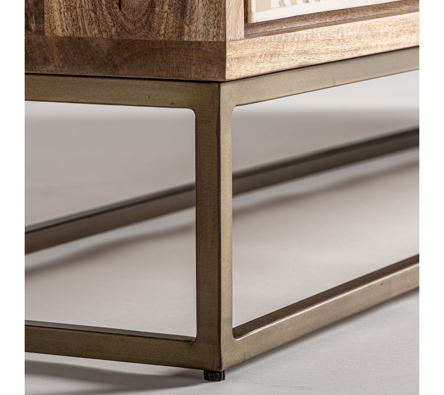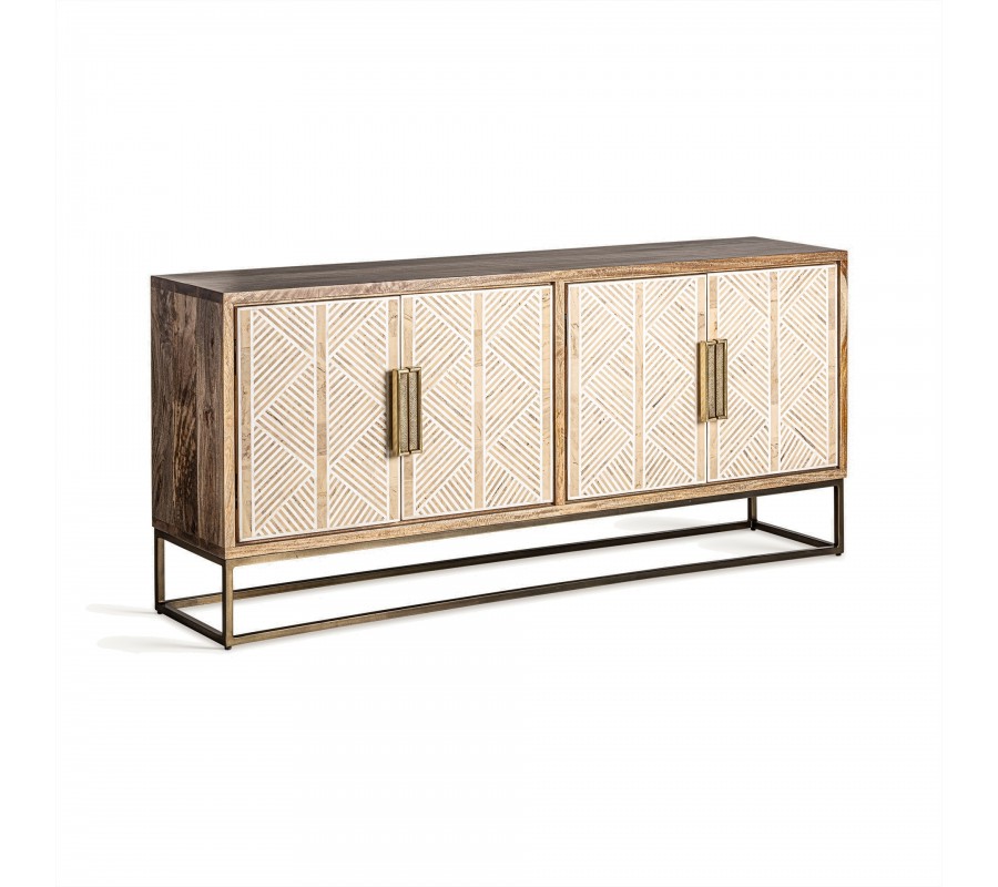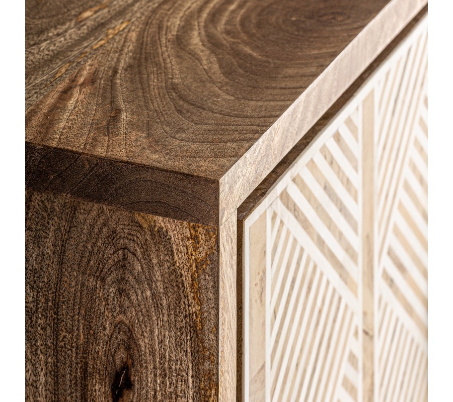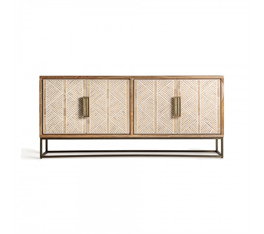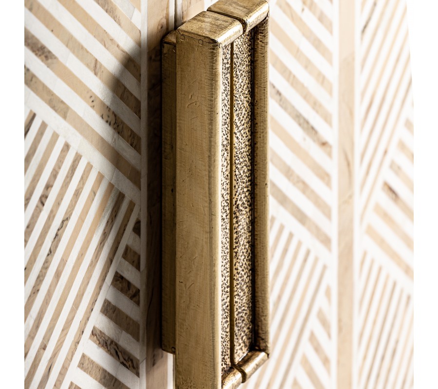 Luxusný príborník Kamal vás uchváti svojím jedinečným vykladaným zdobením dvierok. Vďaka teplým odtieňom od bielej, cez svetlú béžovú, až po tmavšie akcenty v dreve, pôsobí jemný a elegantným dojmom. Kovové úchytky a nožičky mu dodávajú nádych luxusu a v kombinácii s geometrickým vzorom vyzdvihujú art-deco charakter tohto nábytku. Príborník vám ponúka bohatý úložný priestor v dvoch dvojdverových skrinkách, predelených policou. Je vyrobený z masívneho mangového dreva a na rovných povrchoch vyniká jeho prírodná kresba letokruhov. Dvierka sú zdobené inkrustáciou, čo je metóda ukladania malých kúskov materiálu - v tomto prípade kostí - do požadovaného vzoru. Tenké diagonálne línie tvoriace delikátny dizajn v jemných svetlých odtieňov béžovej sú dôkazom remeselnej zručnosti. Nábytku dodáva moderný a sofistikovaný vzhľad. Príborník môžete doplniť ďalším nábytkom v art deco štýle, napríklad jedálenským stolom či stoličkami so zlatými kovovými nožičkami v jedálni, alebo bouclé sedačkou v obývačke. Farebne sa hodí do priestorov zariadených v neutrálnych svetlých odtieňov béžovej a hnedej, ktoré oživí svojím originálnym zdobení. Univerzálne prevedenie vám však umožňuje pridať aj farebné či lesklé metalické doplnky.