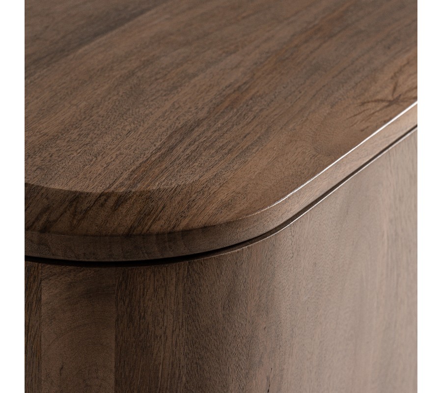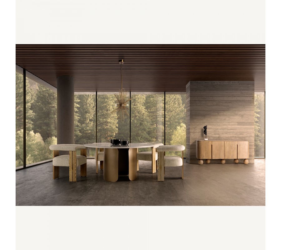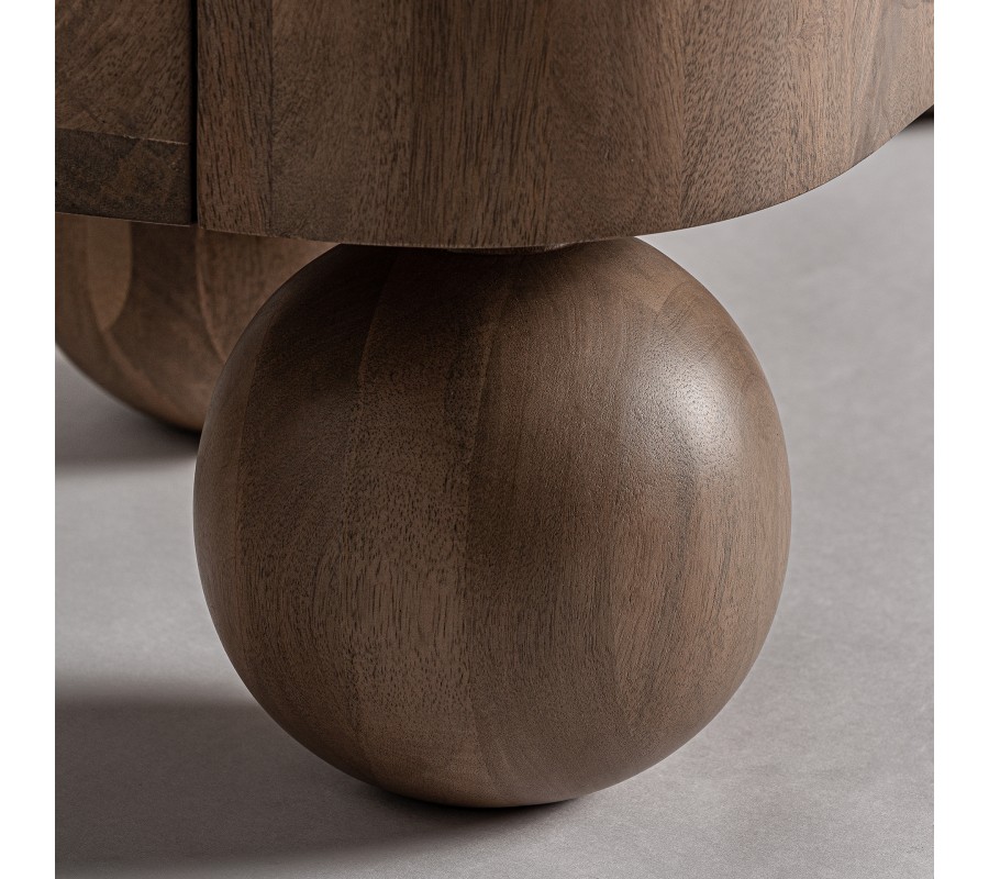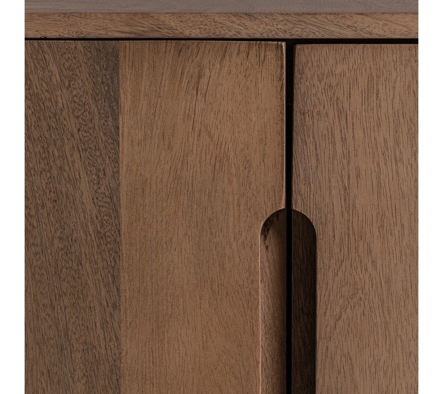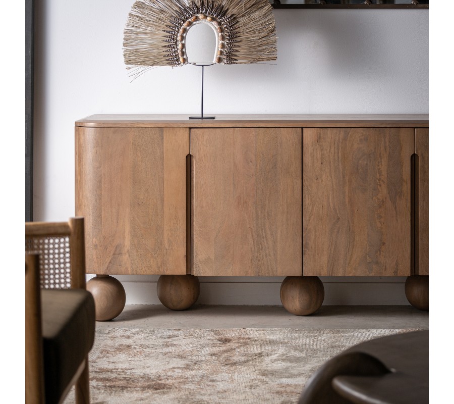 Luxusný príborník Palawan vás očarí krásou masívneho mangového dreva. Jeho svetlá hnedá farba s teplými podtónmi a prirodzená kresba dreva prinesú do vašej obývačky či jedálne výnimočný naturálny prvok. Prírodné charakteristiky materiálu majú možnosť vyniknúť aj vďaka modernej siluete s hladkými povrchmi. Hrany príborníka sú zaoblené, čo dodáva dizajnu plynulosť a tiež korešpondujú s piatimi originálnymi nožičkami v tvare gule, ktoré dodávajú nábytku skvelú stabilitu a sú zároveň zaujímavým vizuálnym a dekoratívnym prvkom. Predná časť je predelená tromi zvislými líniami, ktoré vymedzujú štvoricu dvierok. Úložný priestor tvoria dve skrinky predelené policou a poskytujú vám bohatý úložný priestor na riady či barové vybavenie. Dvierka sa otvárajú pomocou dvoch dlhých reliéfnych výrezov so zaoblenými rohmi na vnútornej strane. Absencia úchytiek ešte zdôrazňuje uhladenú modernú estetiku. Príborník môžete doplniť jedálenským stolom z masívneho dreva vo svetlých teplých odtieňoch. Pridaním živých zelených rastlín ešte zvýrazníte naturálny charakter nábytku. Farebne sa hodí do priestorov zariadených v nadčasových neutrálnych odtieňoch, kde vynikne originálny tvar nožičiek a oblé tvary dopomôžu k vytvoreniu harmonickej atmosféry.