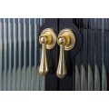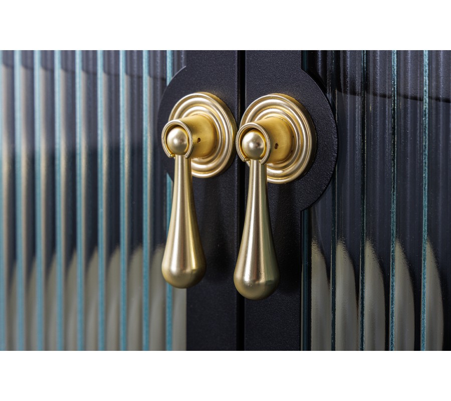 Sklenené časti sú zhotovené z bezpečnostného skla, ktoré je veľmi pevné a odolné. Jeho povrch je upravený originálnym rebrovaným dizajnom, korešpondujúcim s lineárnou siluetou nábytku. Dvierka sa otvárajú pomocou kovovej úchytky v zlatej farbe. Majú okrúhly tvar a dole smerujúcu rúčku v tvare slzy. Nábytku dodáva sofistikovaný prvok a luxusný farebný akcent.
