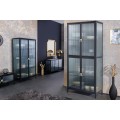 Konštrukcia príborníka je zhotovená z čierneho lakovaného kovu. Úložný priestor je zložený z jednej dvojdverovej a jednej jednodverovej skrinky. Sú predelené policou, čo vám poskytuje dostatok priestoru na uloženie riadov či fliaš. Bočné strany a dvierka majú polopriehľadnú výplň. Umiestnením predmetov s atypickou siluetou či s výraznými farbami tak vytvoríte zaujímavý dekoračný prvok.
