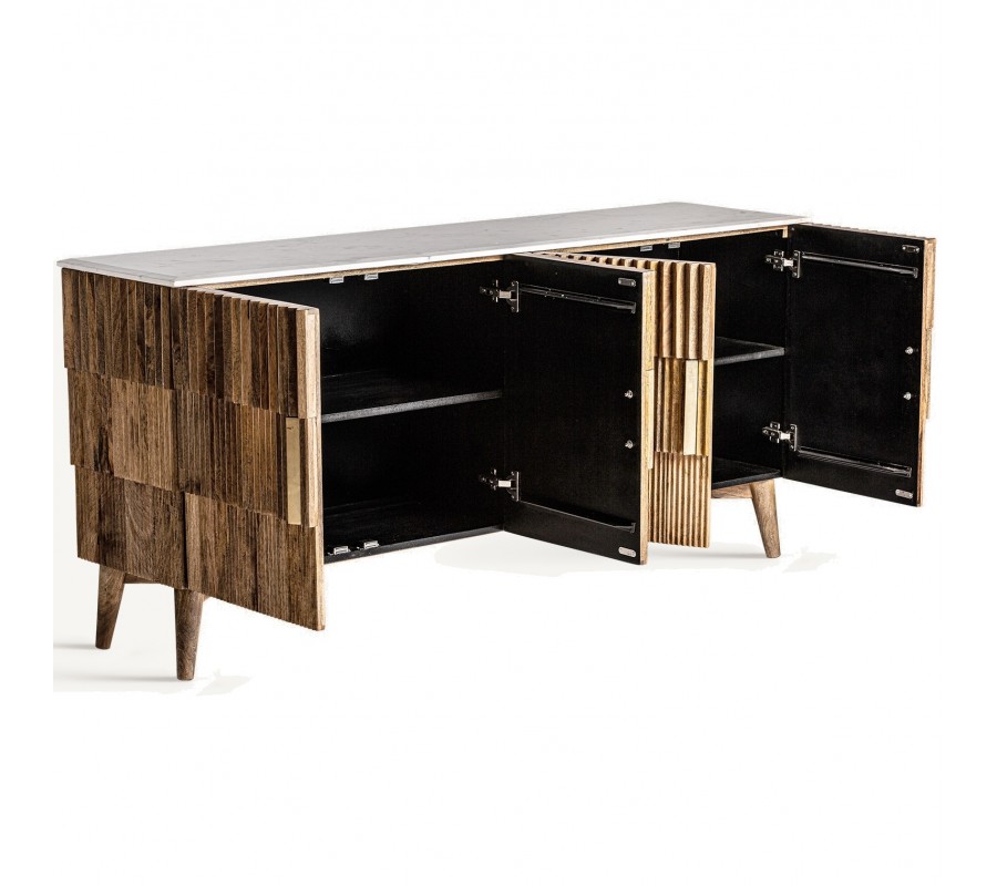 Úložný priestor je tvorený dvomi dvojdverovými skrinkami predelenými policou. Interiér nábytku má čiernu farbu, čo pôsobí sofistikovaným dojmom. Príborník je postavený na štyroch zošikmených nožičkách v rovnakej naturálnej hnedej farbe, ako dvierka. Vrchná doska je prekrytá bielym mramorovým plátom s jemnou šedou kresbou. Kameň výborne dopĺňa prírodný drevený vzhľad a taktiež poskytuje praktickú a ľahko udržiavateľnú plochu.