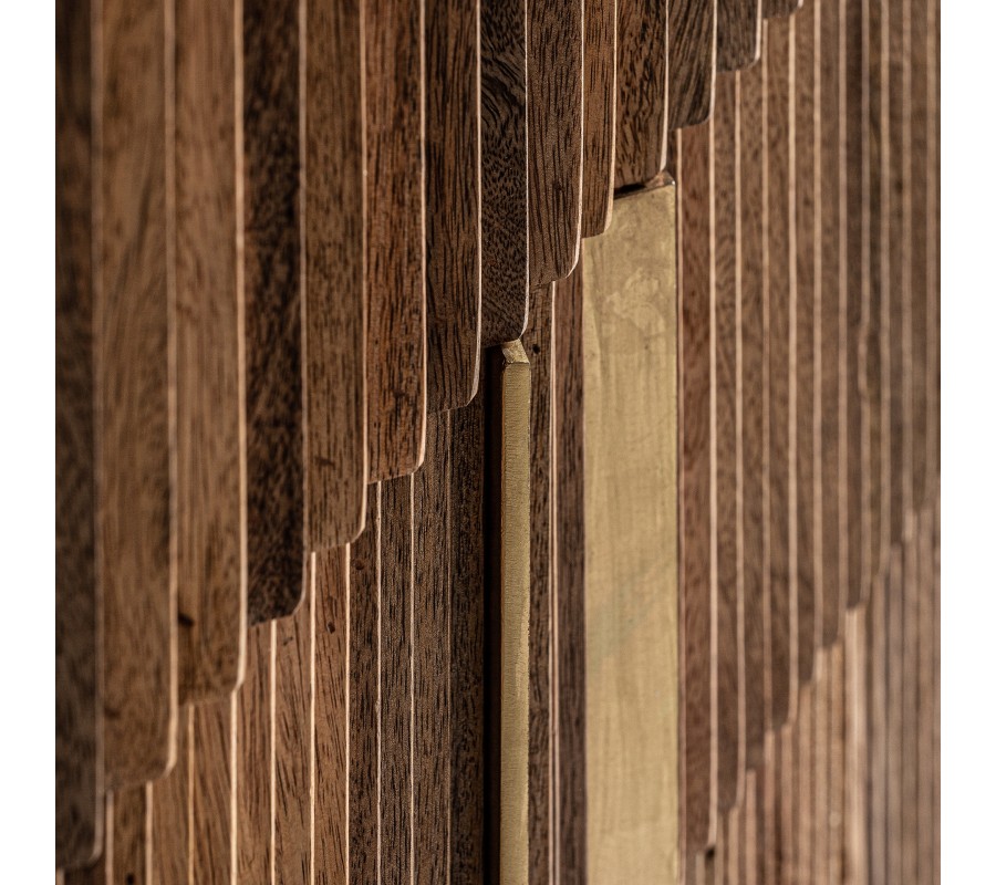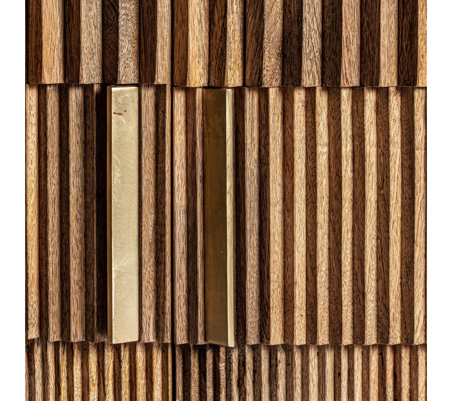 Dizajnu dominuje štvorica dvierok s reliéfnym zdobením. Sú ručne vyrezávané a elegantný harmonikový vzor pripomína krehké origami, aj napriek tomu, že nábytok je zhotovený z pevného kvalitného mangového dreva. Úchytky sú kovové a svojím tvarom prirodzene zapadajú do reliéfu. Ich zlatá farba tiež výborne dopĺňa teplý hnedý odtieň mangového dreva.