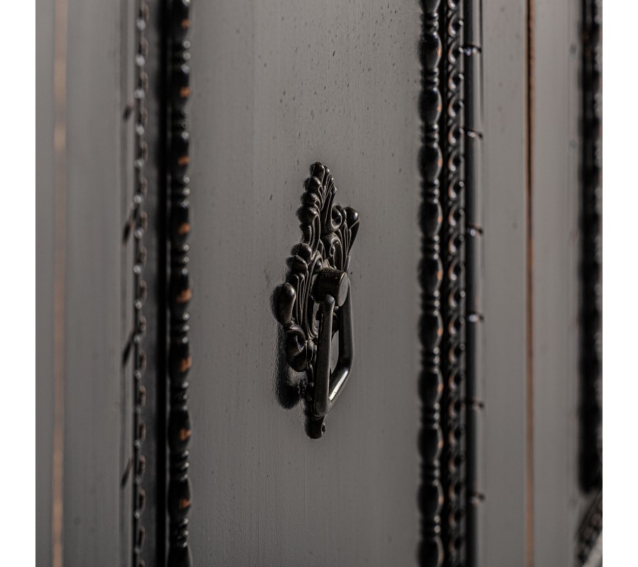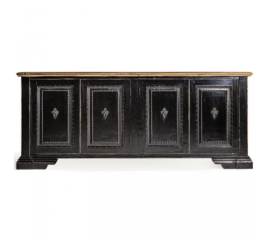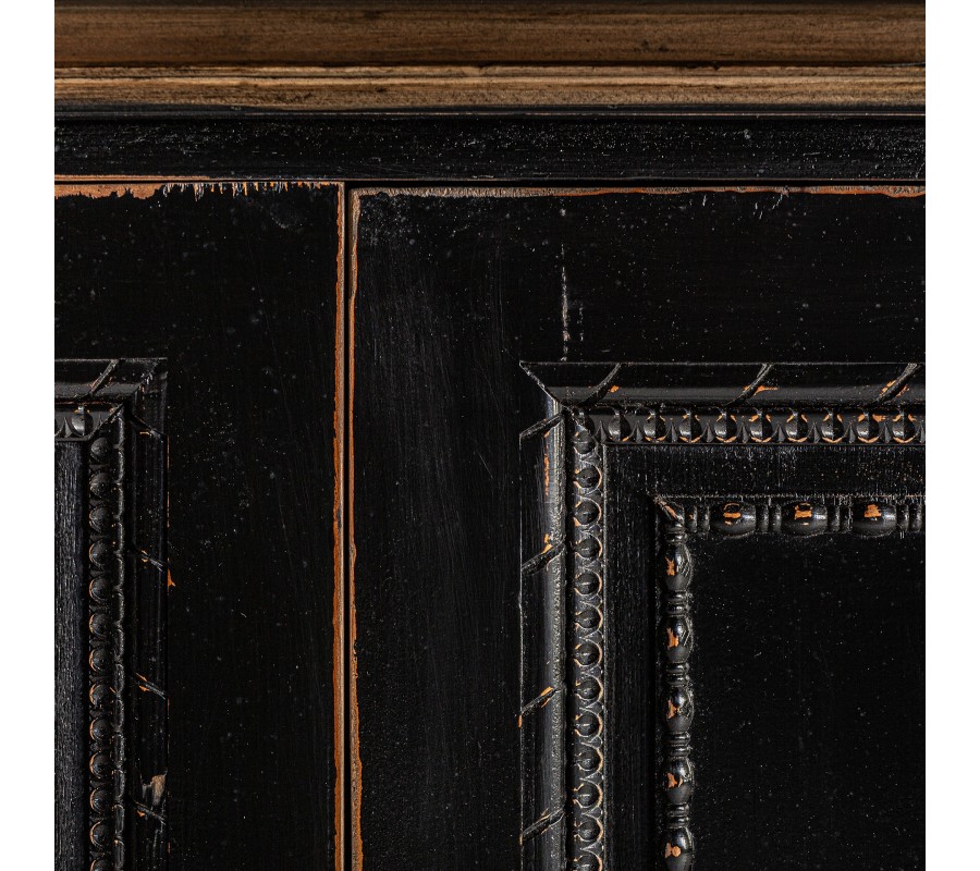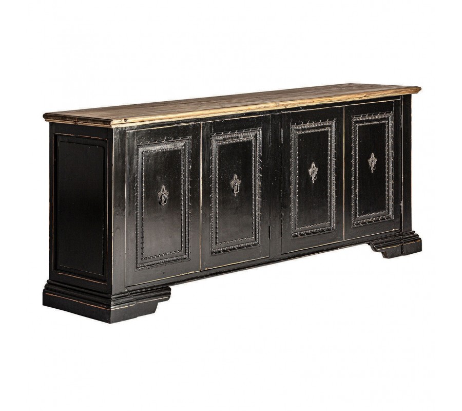 Luxusný štvordverový čierny vintage príborník Laurent s vyrezávaným zdobením a prírodnou hnedou vrchnou doskou 220 cm