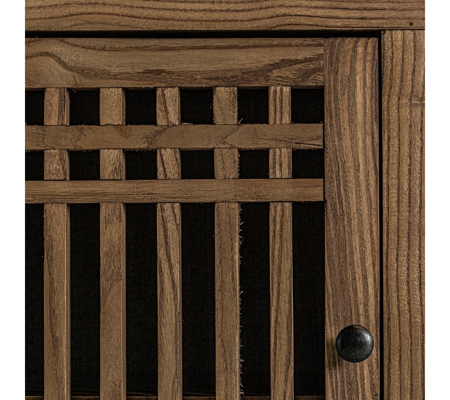 Na prvý pohľad vás očaria jedinečné mrežované dvierka. Sú vyplnené tenkými hranatými lamelami a v kombinácii s prírodným dreveným povrchom tak vzniká výnimočný dizajnový prvok, aký sa objavuje aj v interiéroch či nábytku východnej Ázie, napríklad v tradičných japonských ryokanoch. Dvierka sú tiež čiastočne priehľadné a odhaľujú interiér nábytku predelený policou.