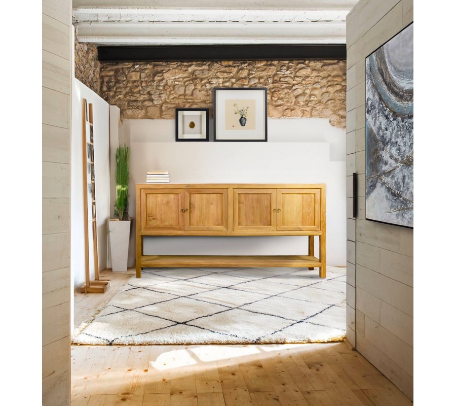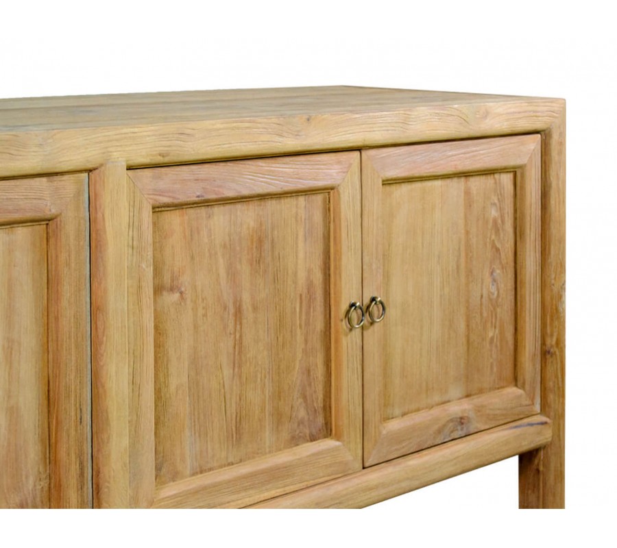 Príborník je vyrobený z masívneho teakového dreva. Na hladkých povrchoch nábytku môžete pozorovať kresbu letokruhov v príjemných, svetlo hnedých odtieňoch. Úchytky na dvierkach sú vyrobené z kovu. Ich okrúhly tvar príjemne kontrastuje s rovnými líniami. Zlatá farba zasa skvele dopĺňa teplý odtieň dreva s prináša do kompozície luxusný nádych.