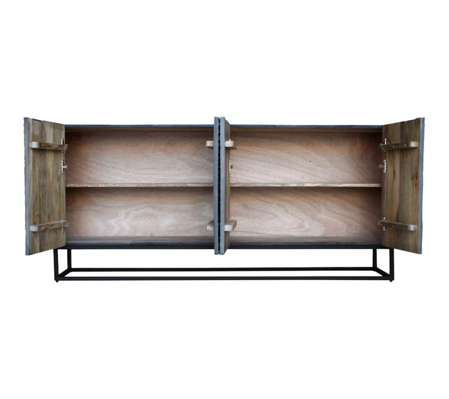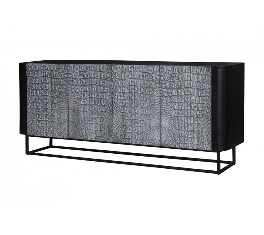 Nábytok má moderný lineárny tvar s jednoduchou obdĺžnikovou podstavou. Je vyrobený z mangového dreva, ktorého prirodzená farba je viditeľná v interiéri príborníka. Vonkajšie strany majú čiernu farbu, s výnimkou ručne vyrezávaného zdobenia dvierok. Reliéf verne zobrazuje vzor krokodílej kože v palete sivých odtieňov. Podstava je zhotovená z kovu v čiernej farbe a prináša do dizajnu nádych industriálneho štýlu.