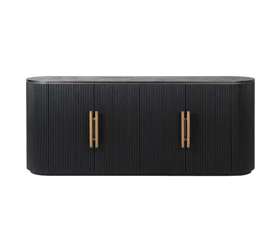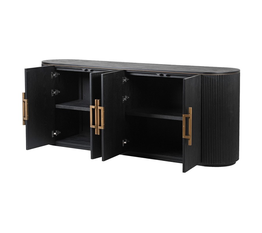 Luxusný art deco štvordverový oválny príborník Costilla so zlatými úchytkami a drážkovaným reliéfom v čiernej farbe 200 cm