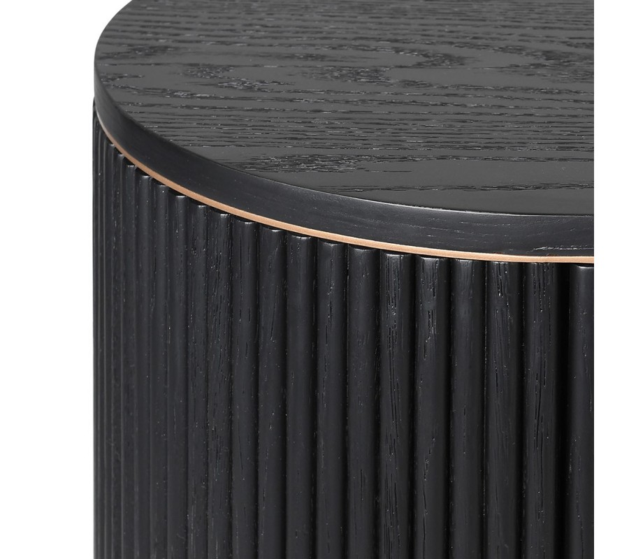 Obvod príborníka zdobí lineárny drážkovaný reliéf. Zvislé lamely majú zaoblený tvar, čo korešponduje s celkovou siluetou nábytku. Toto zdobenie je typické pre štýl art deco a prepája sa s ním aj štíhly valcovitý tvar úchytiek. Sú vyrobené z kovu a ich zlatá farba prináša do dizajnu nádych luxusu. Interiér aj exteriér príborníka má čiernu farbu, ktorá zdôrazňuje sofistikovanú eleganciu.