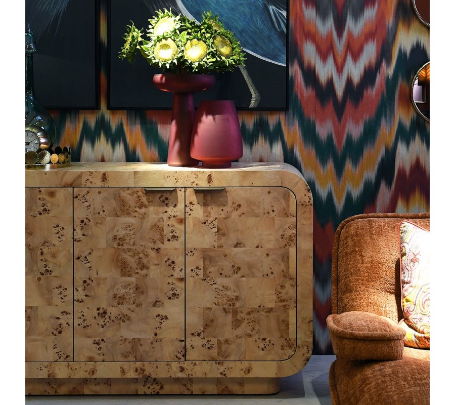 Príborník Ygritte je očarujúcim spojením jedinečného burl dreva a dizajnu s nádychom retro štýlu. Jedálni dodá prírodný prvok s originálnym vizuálom a poteší vás aj bohatý úložný priestor v podobe dvoch dvojdverových skriniek.