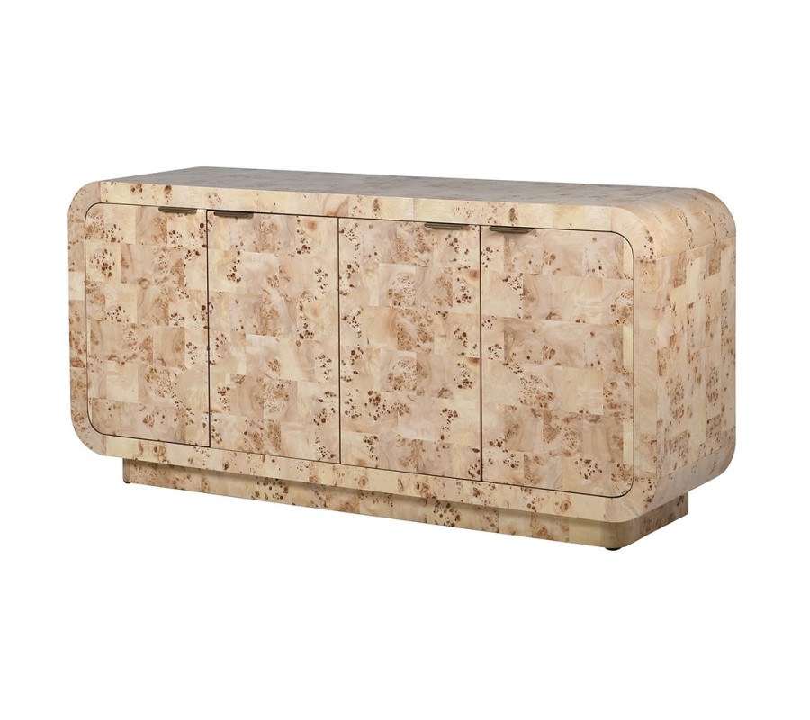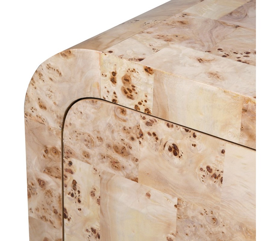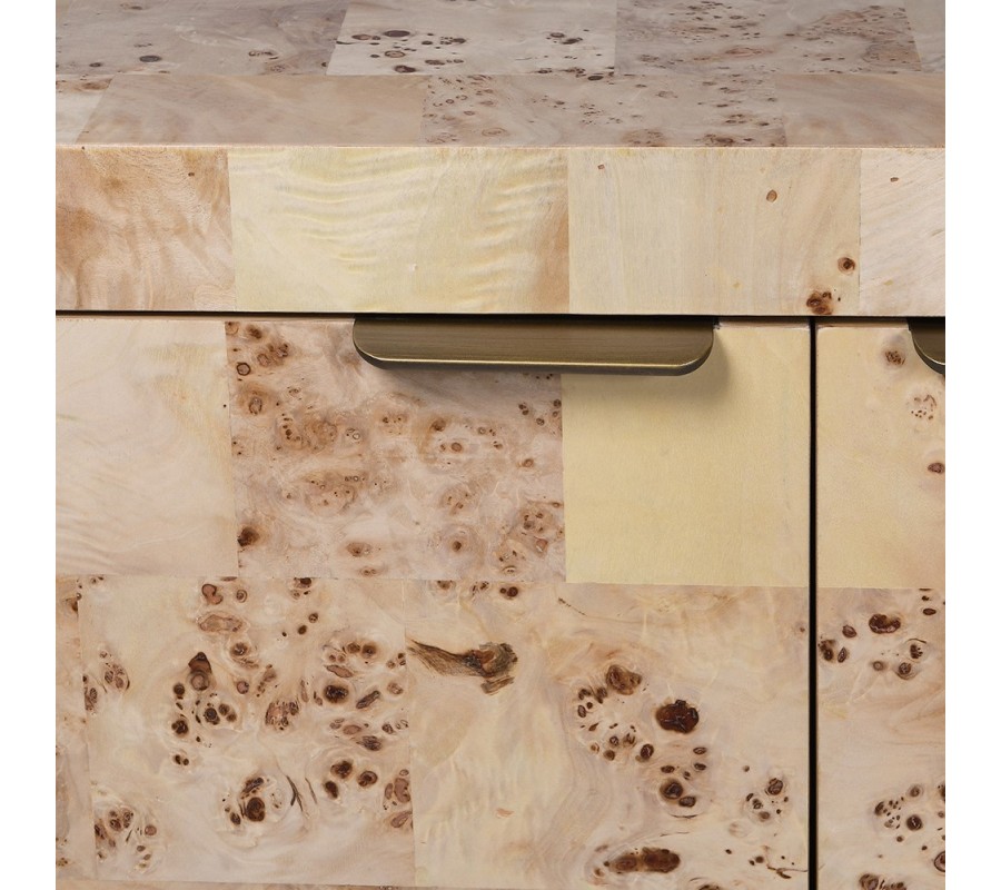 Príborník je vyrobený z burl dreva, ktoré je v nábytkárstve veľmi populárne. Nejde o drevo z konkrétneho stromu, ale charakterizuje ho spôsob rastu. Pochádza z nevyklíčených a spiacich výrastkov, ktoré sa prejavujú ako hrče na dreve. Tento materiál je koncentrovaný a má vyššiu tvrdosť, ako zvyšné časti stromu. Takisto je vyhľadávaný kvôli svojmu vizuálu. Atypický rast vytvára pri priereze jedinečné asymetrické štruktúry a vzory, ktoré v podmanivej geometrickej mozaike zdobia exteriér príborníka. Upúta vás tiež široké spektrum svetlých hnedých odtieňov dreva.