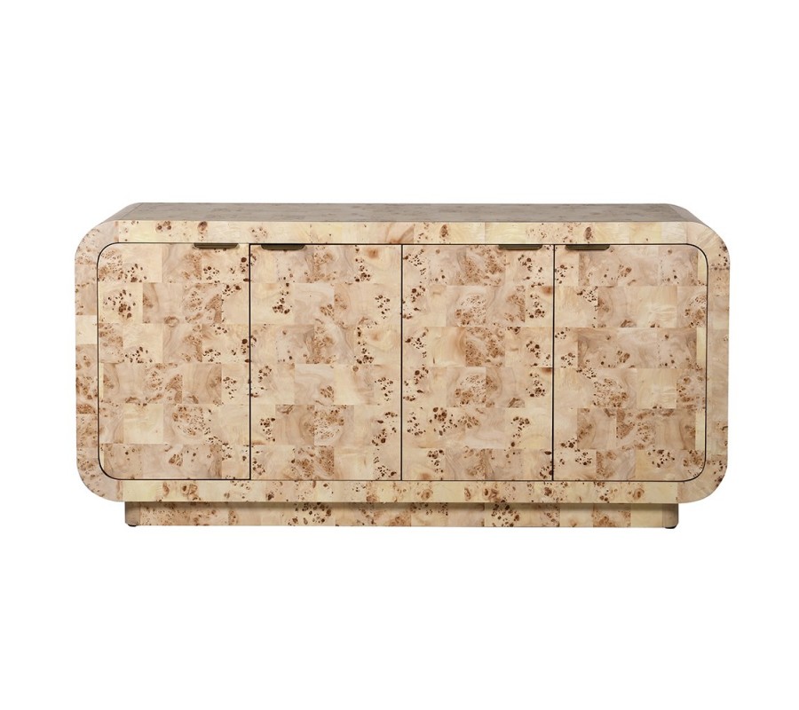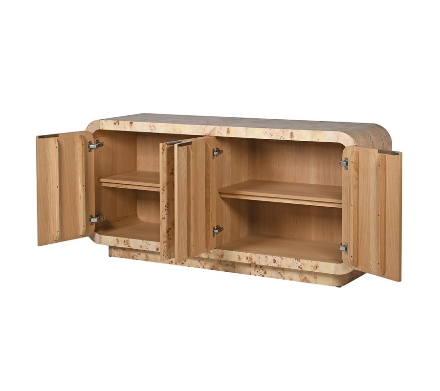 Luxusný retro štvordverový príborník Ygritte so zaoblenými hranami zo svetlého hnedého burl dreva 180 cm