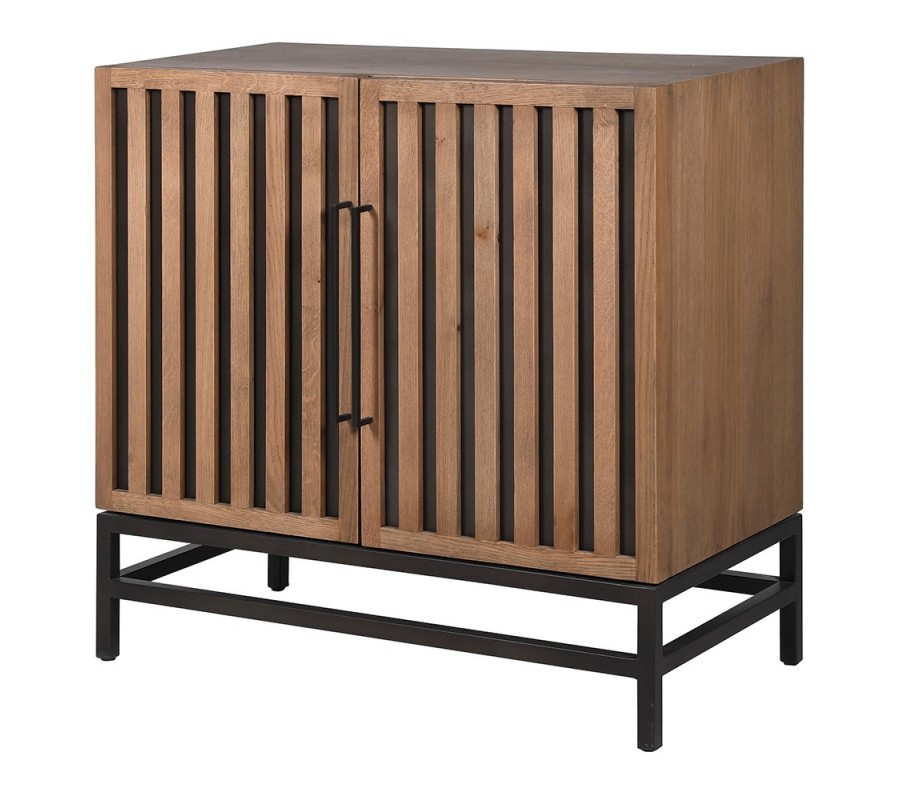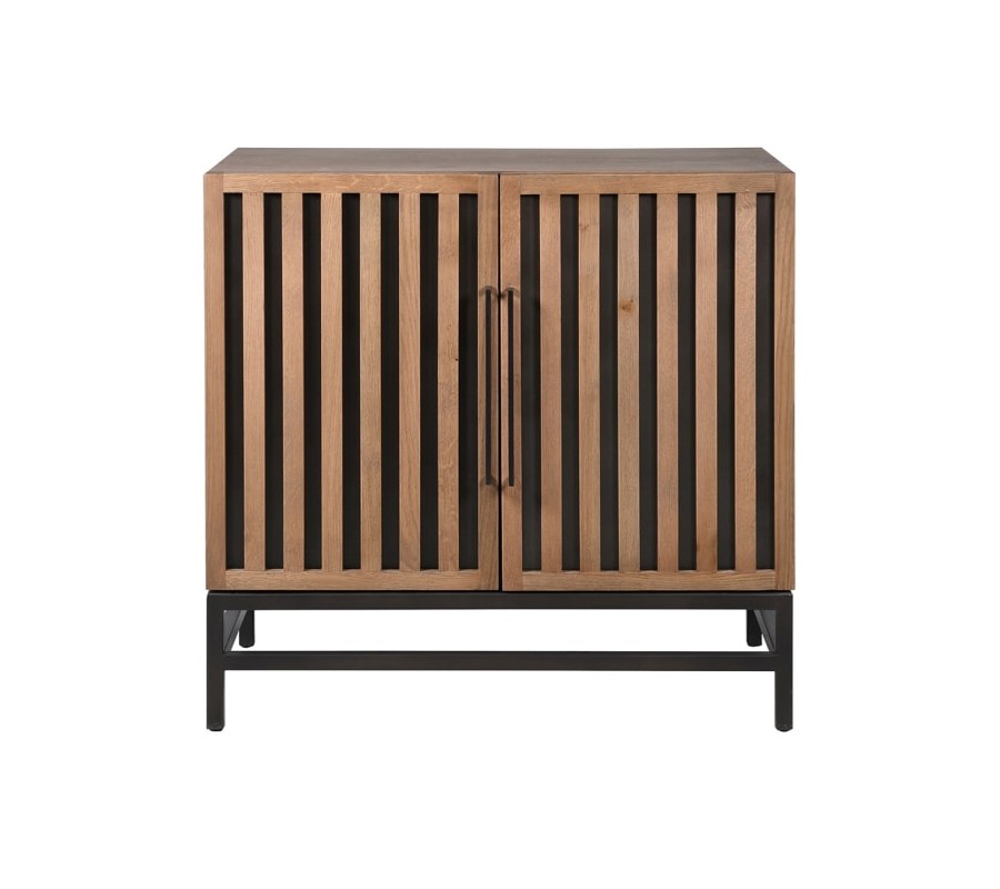 Moderný masívny príborník Monty s dvojitými dvierkami s lamelovým dizajnom v hnedej farbe s čiernou kovovou podstavou 87 cm