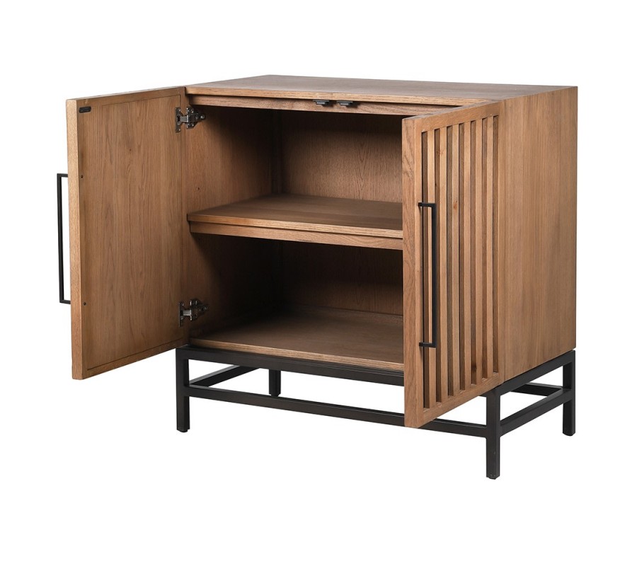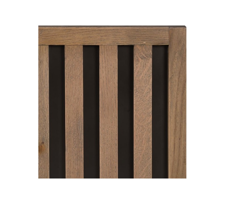 Príborník je vyrobený z kombinácie masívneho a dyhovaného dubového dreva. Má príjemnú svetlú hnedú farbu s jemnou kresbou letokruhov, ktorá zdôrazňuje naturálny charakter materiálu. Dizajnu dominujú dvojité dvierka, ozdobené radom vertikálnych hranatých lamiel. Za nimi sa nachádza úložný priestor predelený policou, ktorý vám poskytne dostatok miesta na riady či kuchynské textílie.